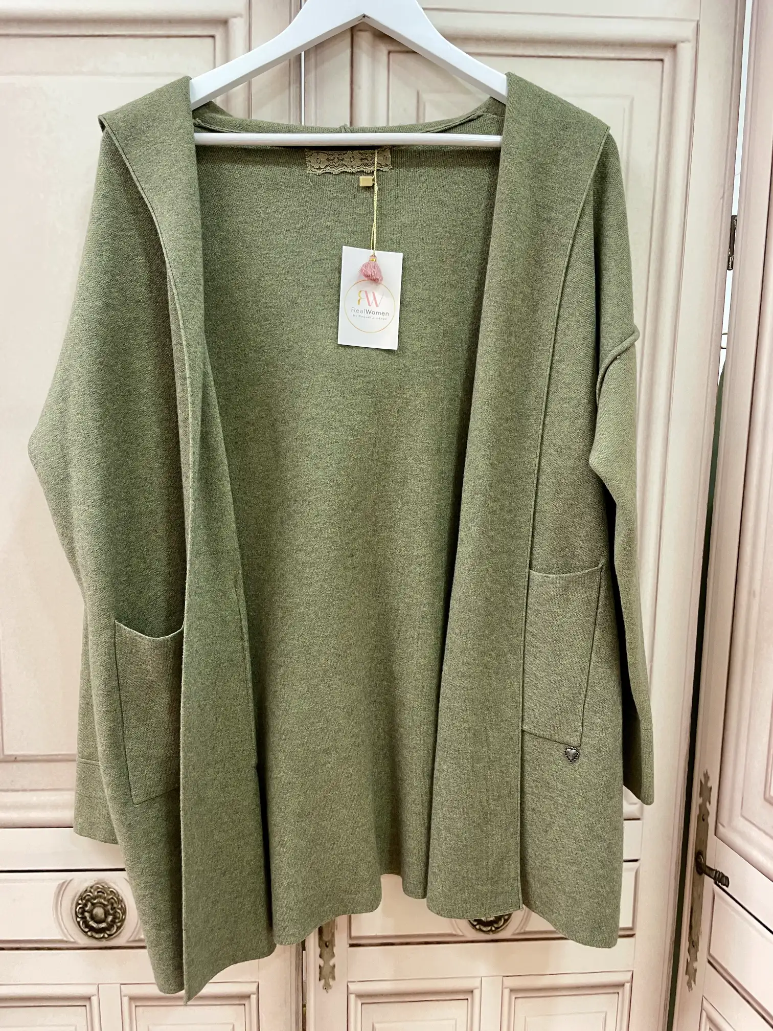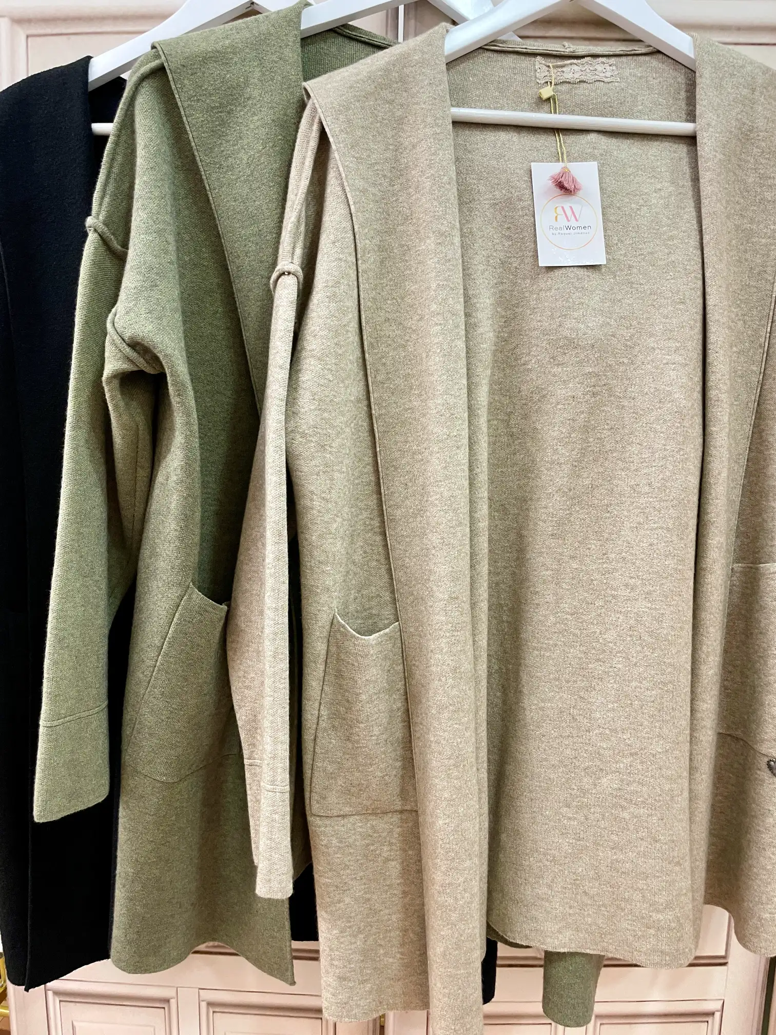 Abrigo de punto con capucha. Tiene dos bolsillos a los lados. Muy estiloso y cómodo. Largo aproximado de 75 cm. Es abierto y sin botones.