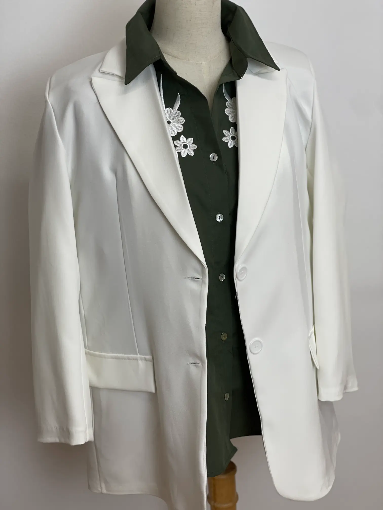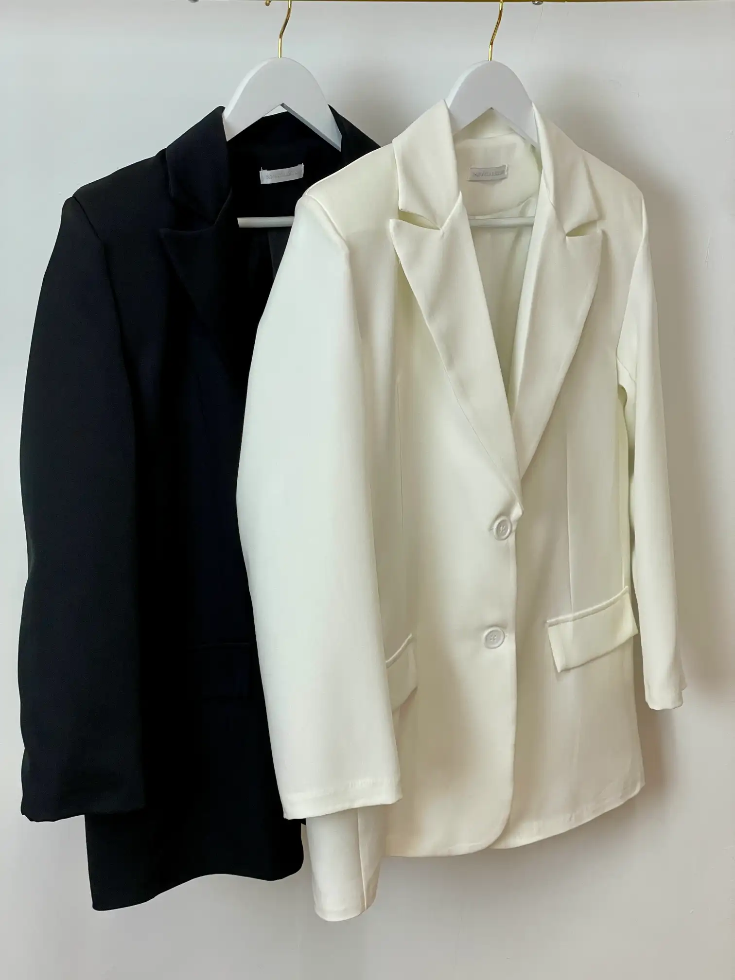 Blazer básica con hombreras. Solapas de imitación de bolsillos a ambos lados. Las mangas están ligeramente fruncidas. Disponible en blanco y negro.