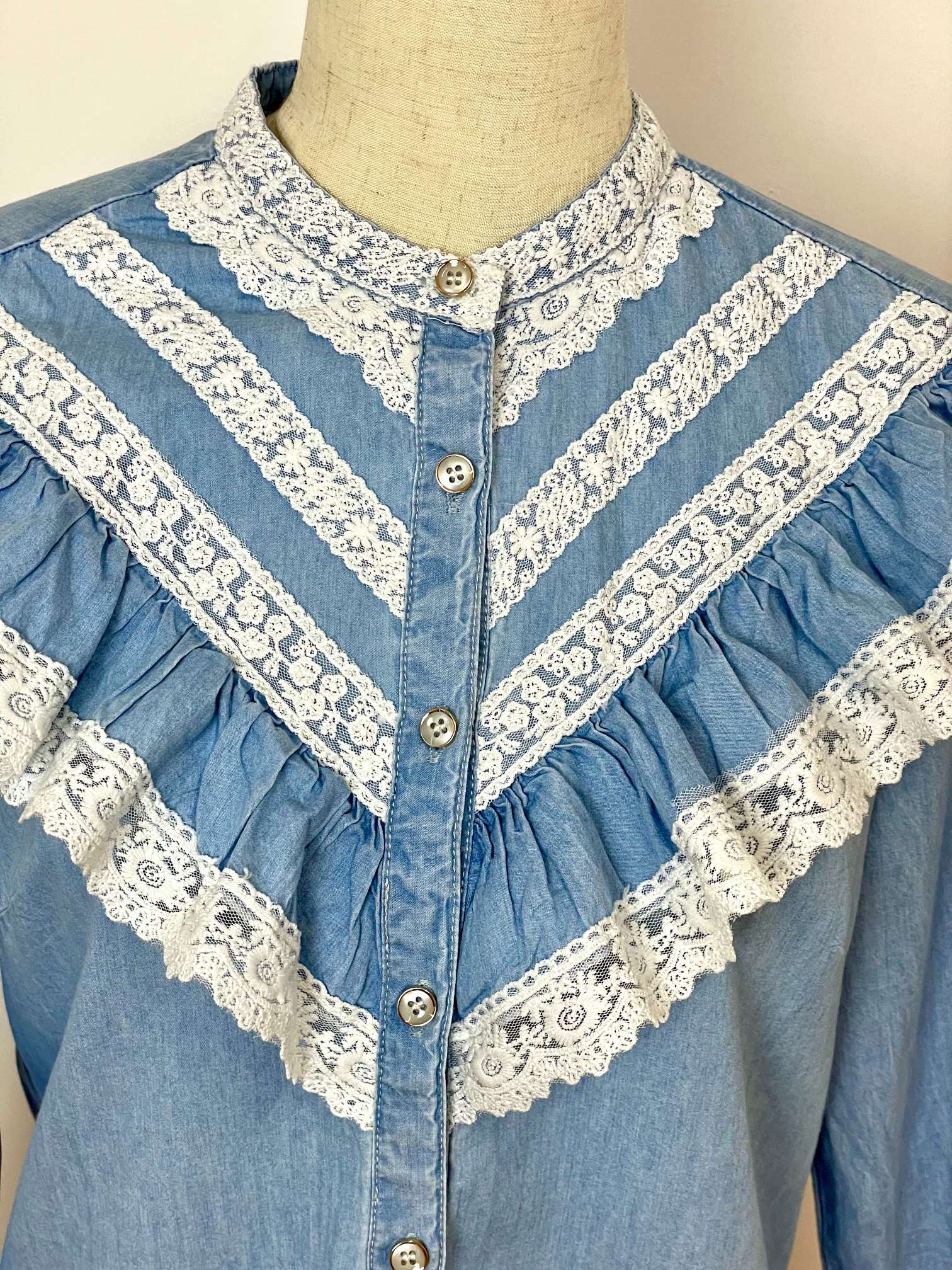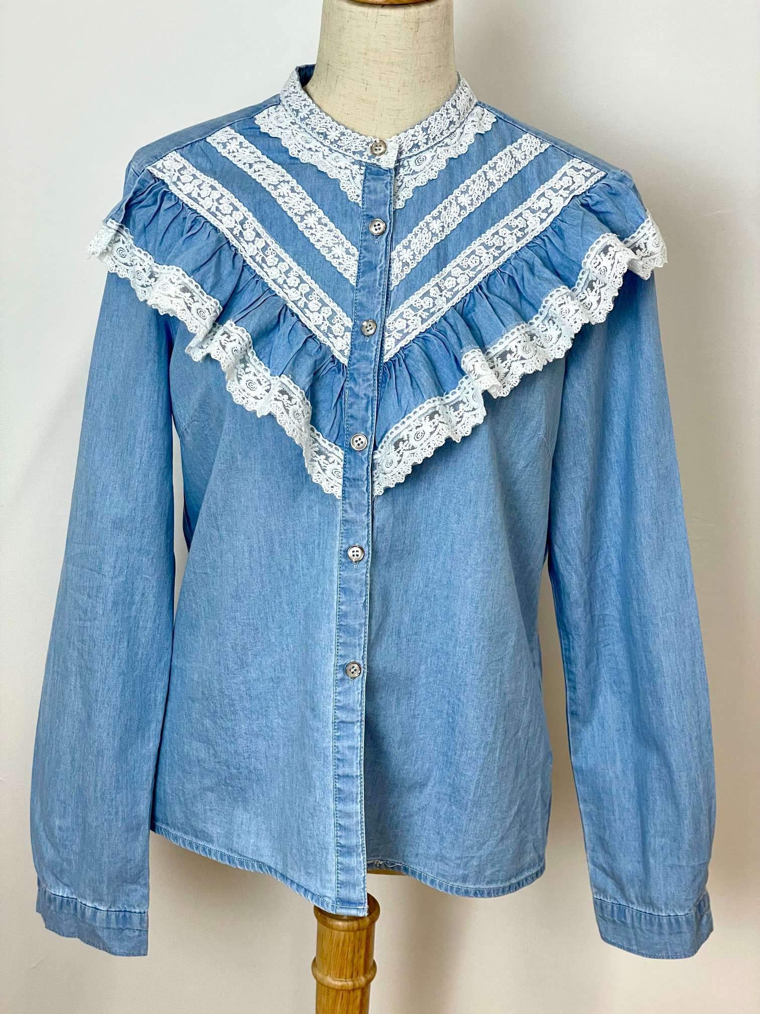Camisa denim azul claro con puntilla blanca en pecho. Tiene un volante en parte delantera