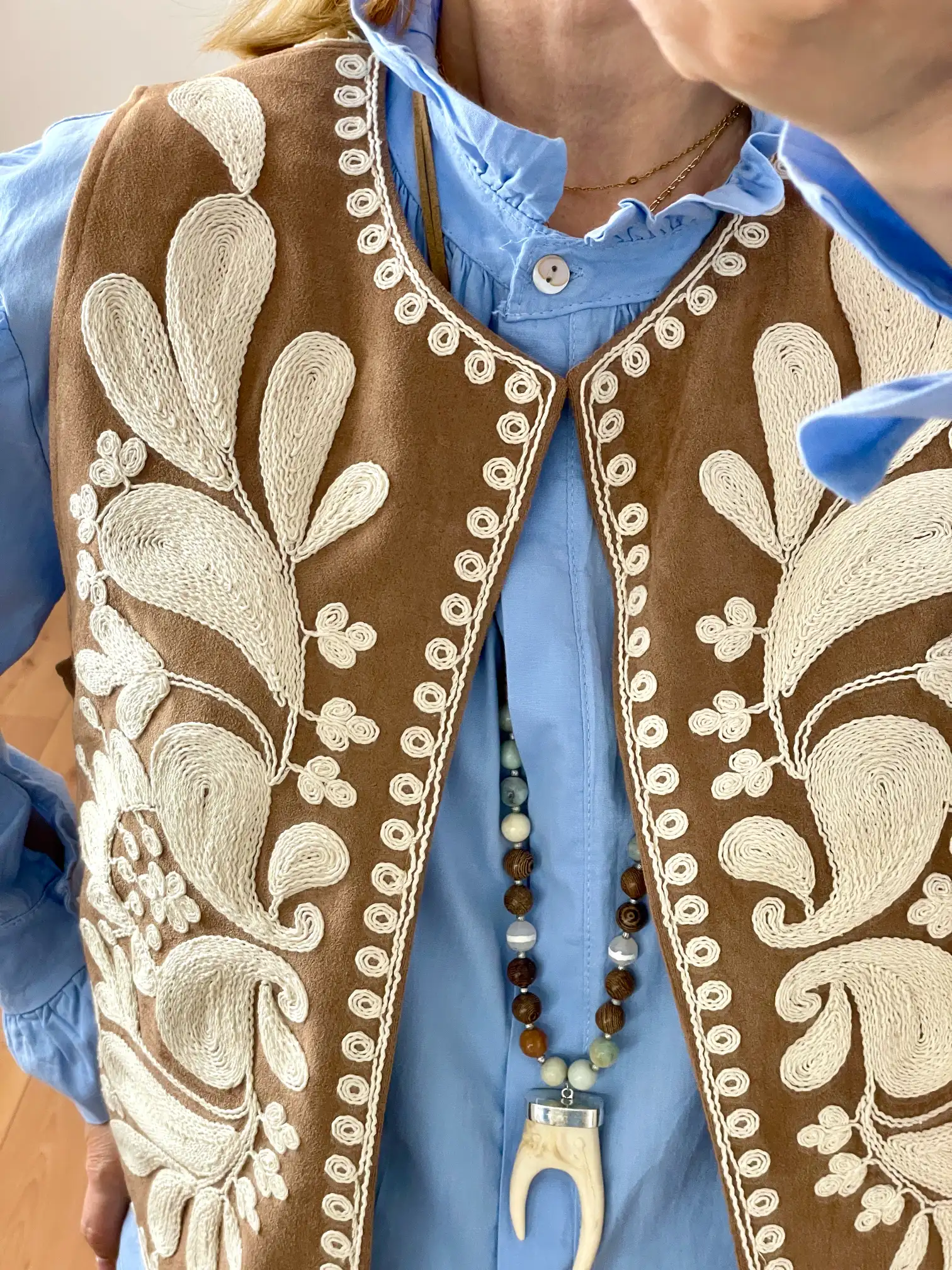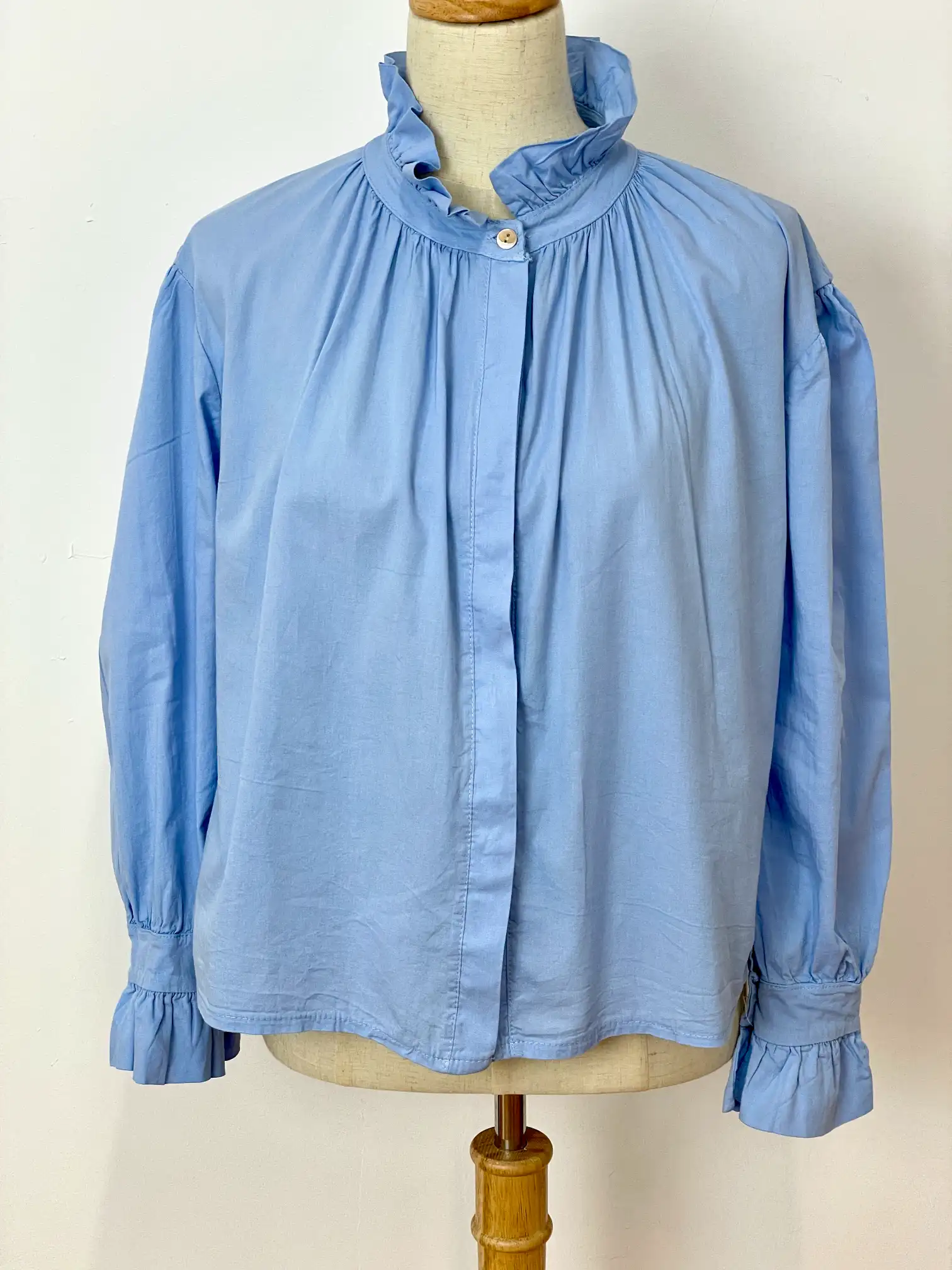 Camisa azul con cuello mao muy fruncido. Tiene también frunce en los hombros y es muy amplia. Tiene unos pequeños volantes en las mangas. Largo aproximado desde el hombro: 55cm