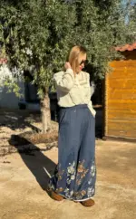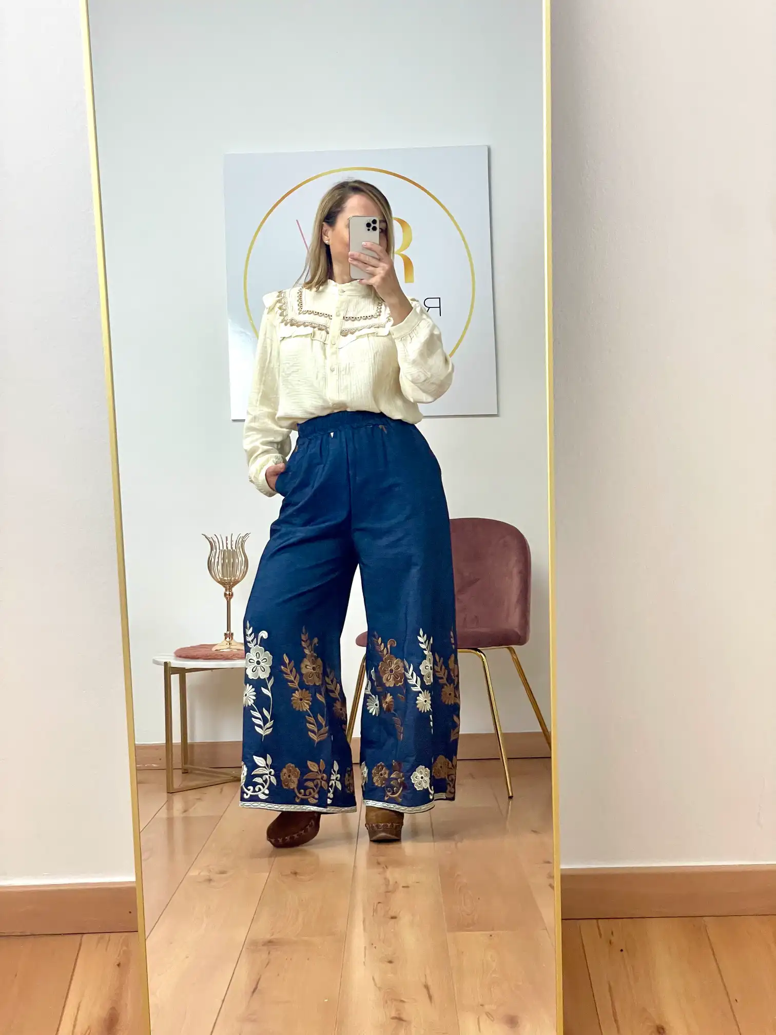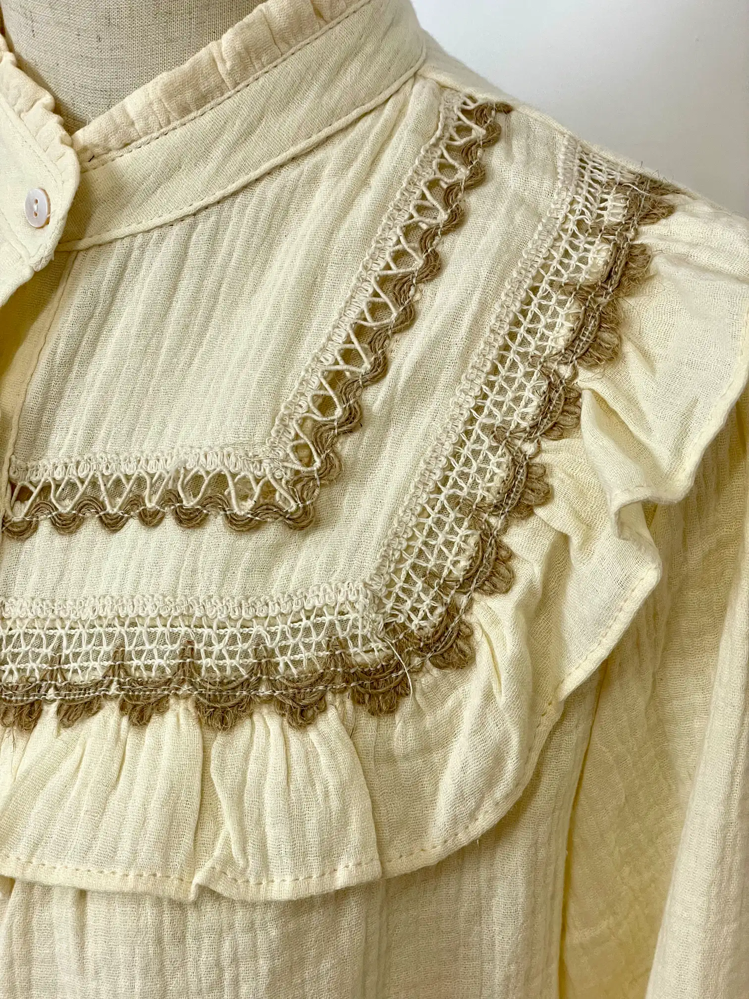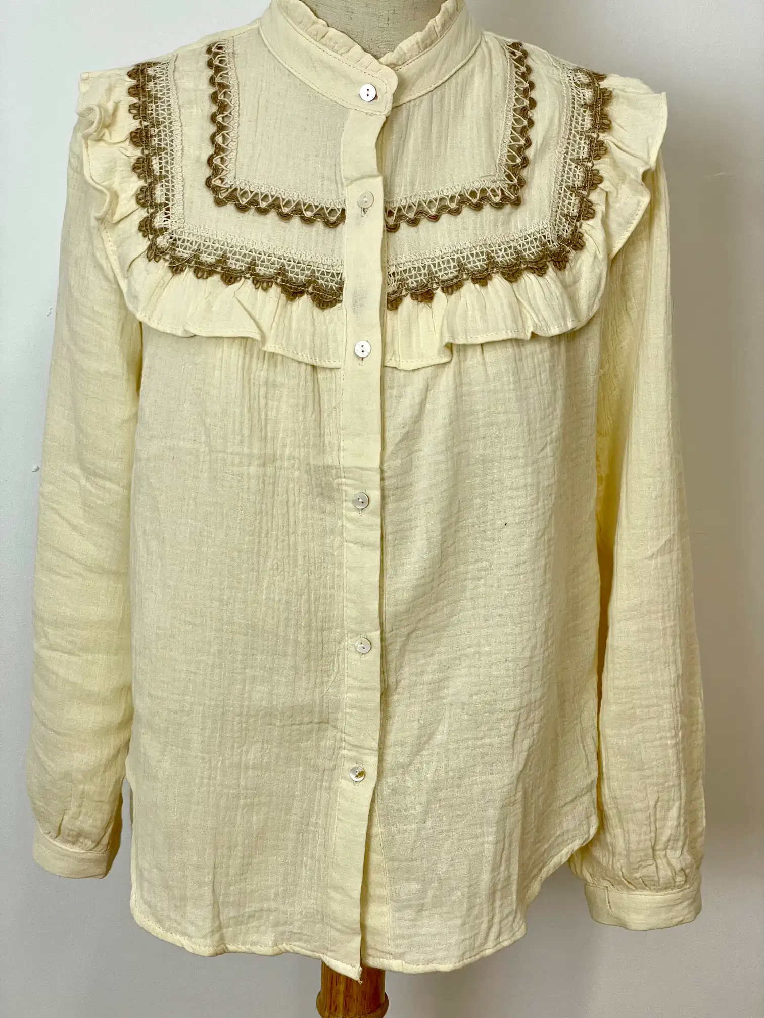 Camisa de estilo boho. Tiene alrededor del cuello un frunce y un bordado en color chocolate