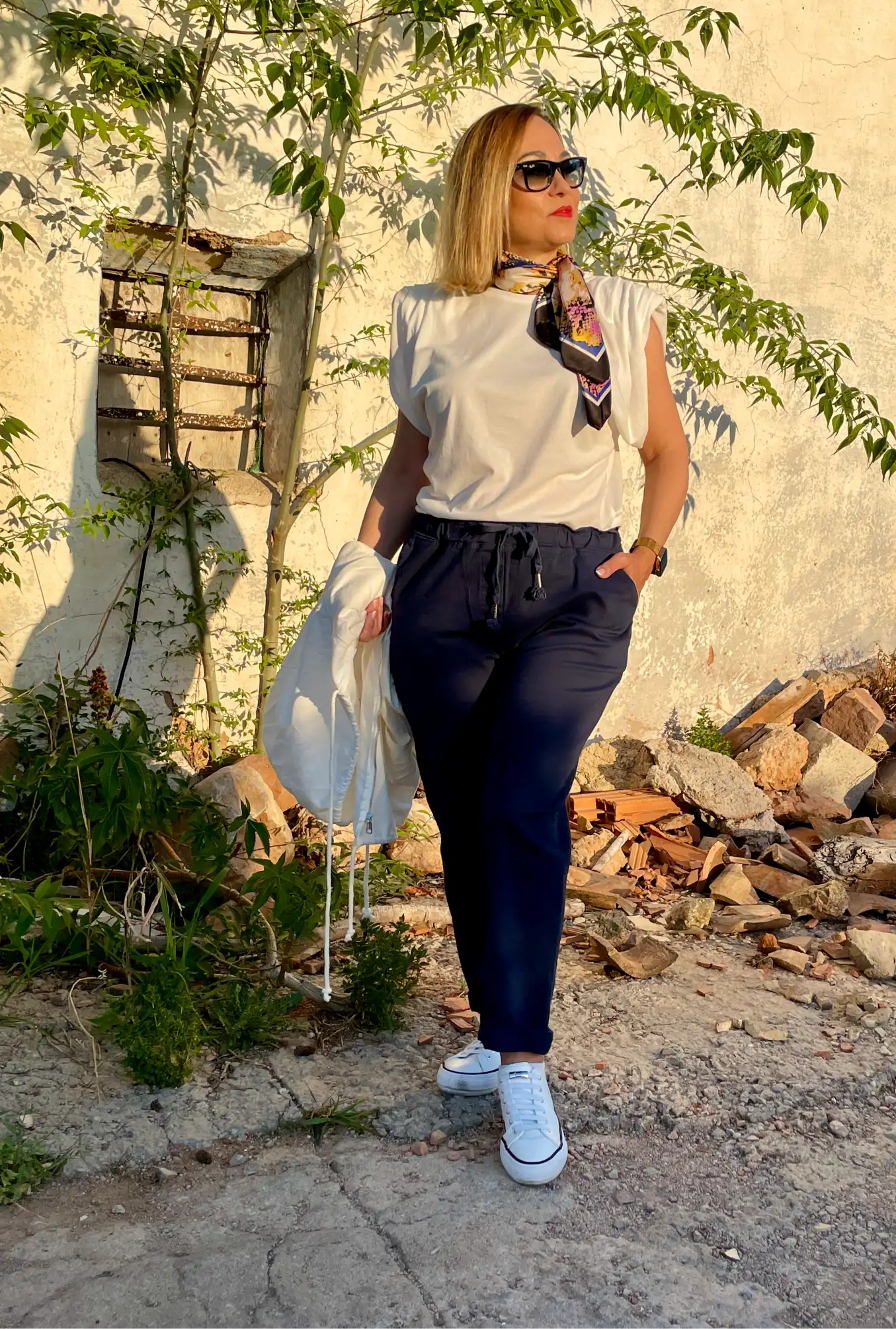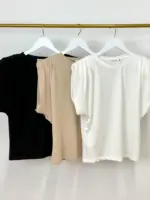 Camiseta básica con grandes hombreras fruncidas. Disponible en blanca, beige y negra
