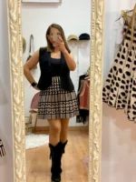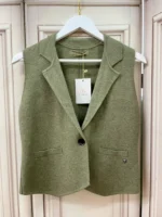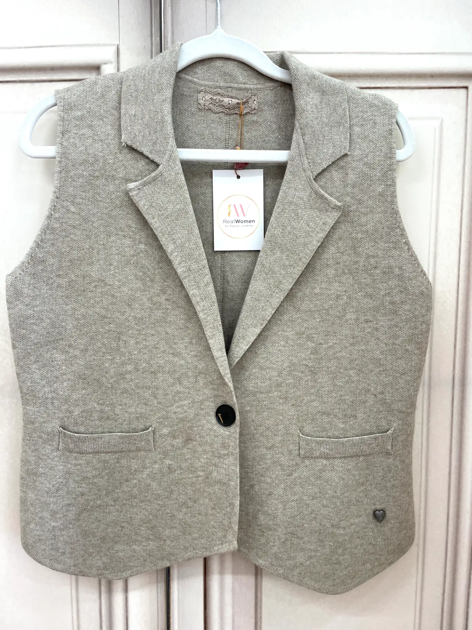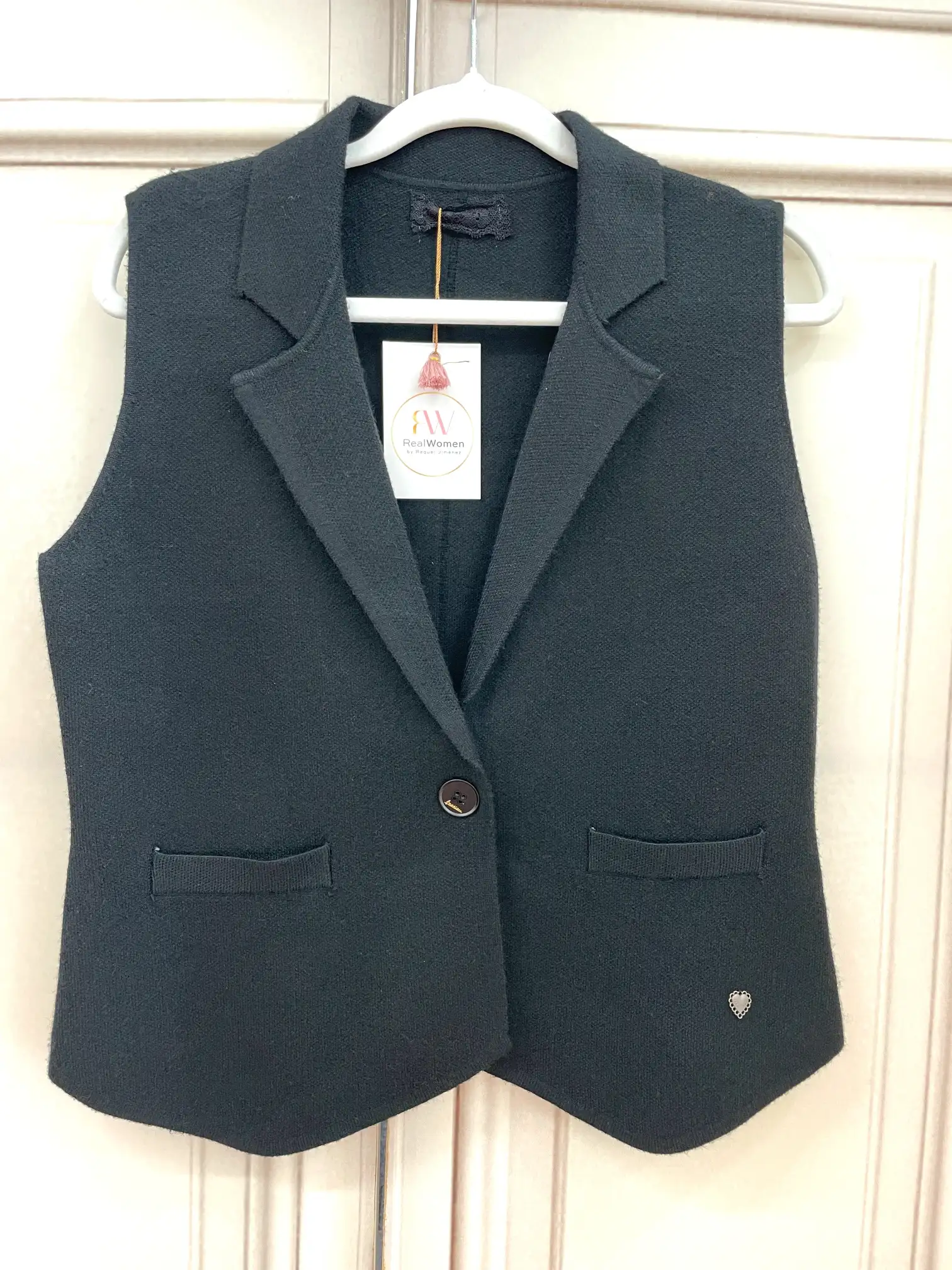Chaleco de punto. Las medidas de sisa a sisa son de 47 cm. Cierra con un botón y lleva falsos bolsillos de adorno