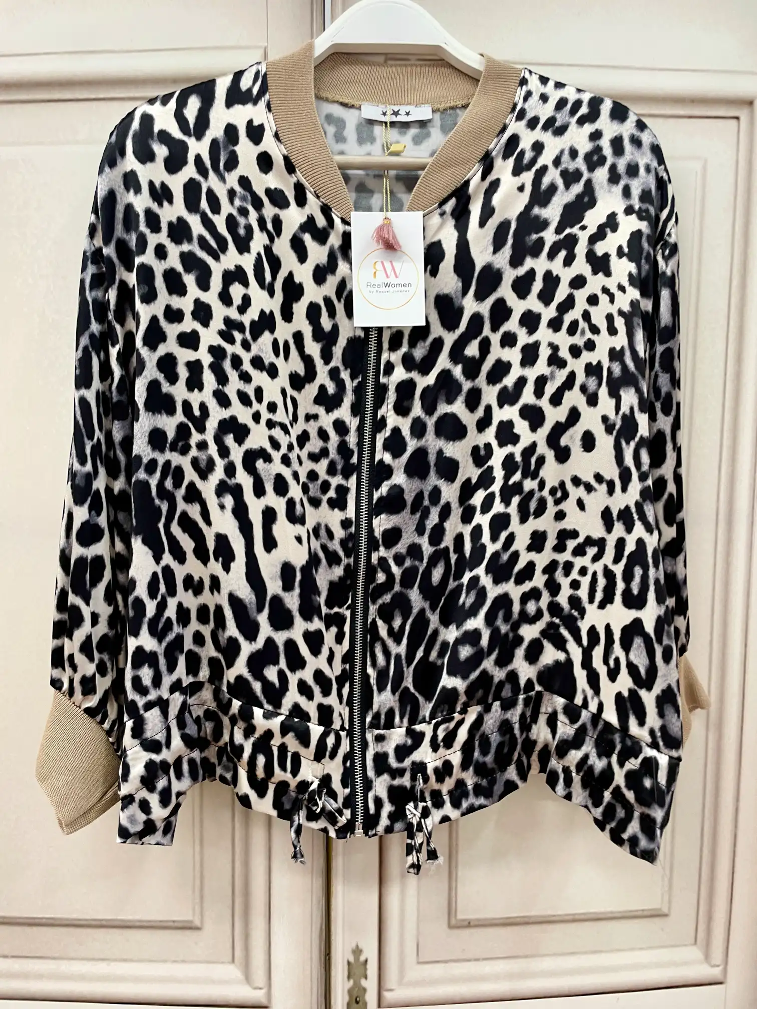 Chaqueta satinada con estampado de leopardo. Lleva goma en los puños y cuello en tono beige y cordones para fruncir en la cintura