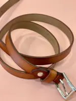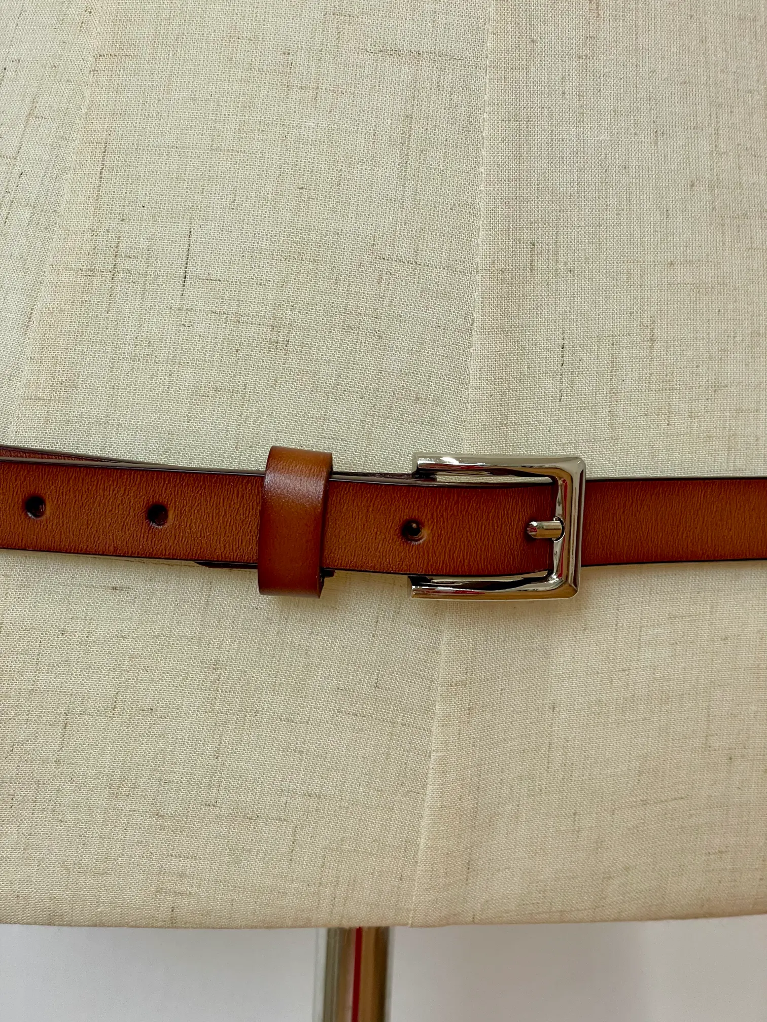 Cinturón básico en camel. Tiene la hebilla plateada. El ancho mide 2 cm