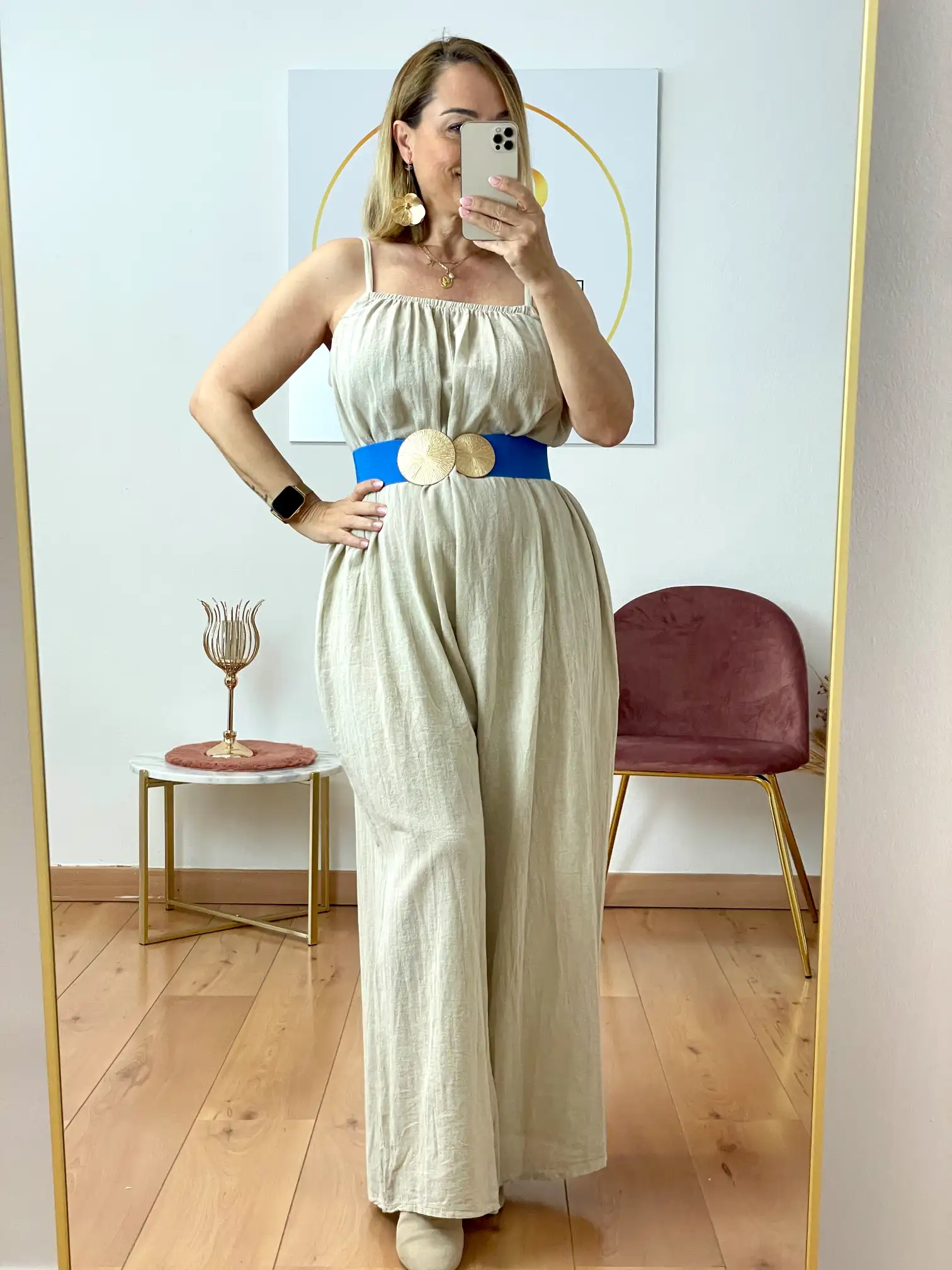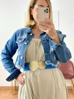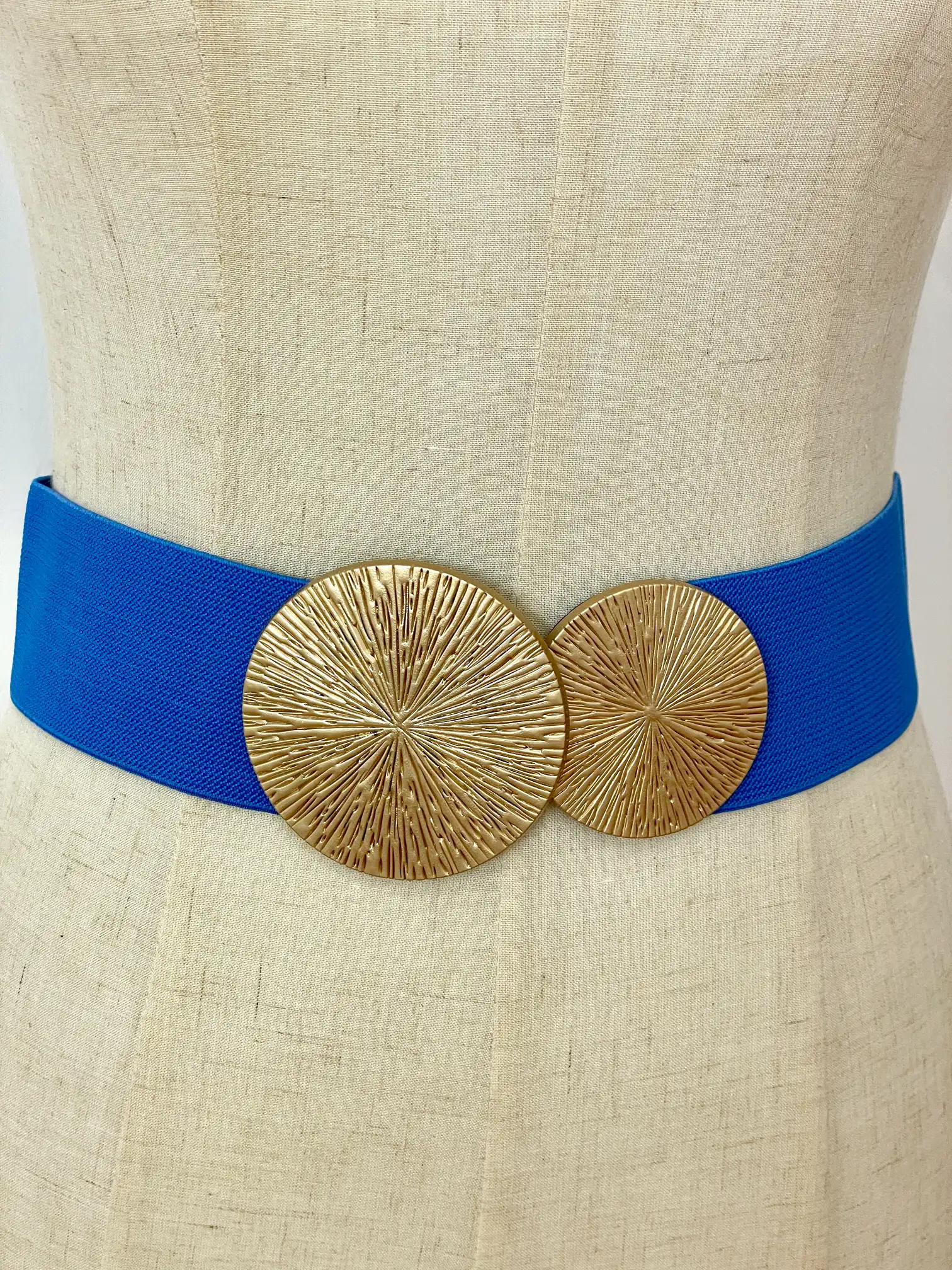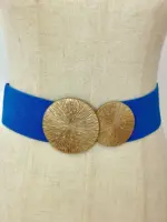 Cinturón engomado que se ajusta a cualquier talla. Lleva la hebilla en color oro con dos círculos