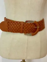 Cinturón con goma y con toda la parte delantera y la hebilla trenzadas. Es auto regulable y el ancho mide 6 cm
