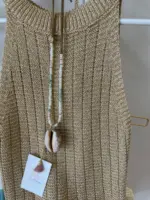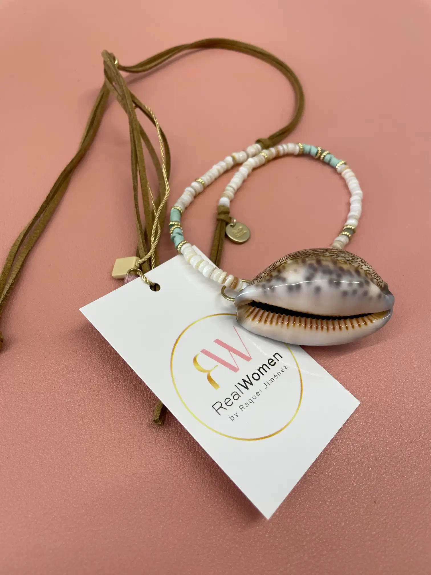 Collar de cuentas pequeñas en tonos blanco y turquesa y pequeños apliques dorados. Lleva también cordón ajustable en cuero y una caracola grande como adorno central