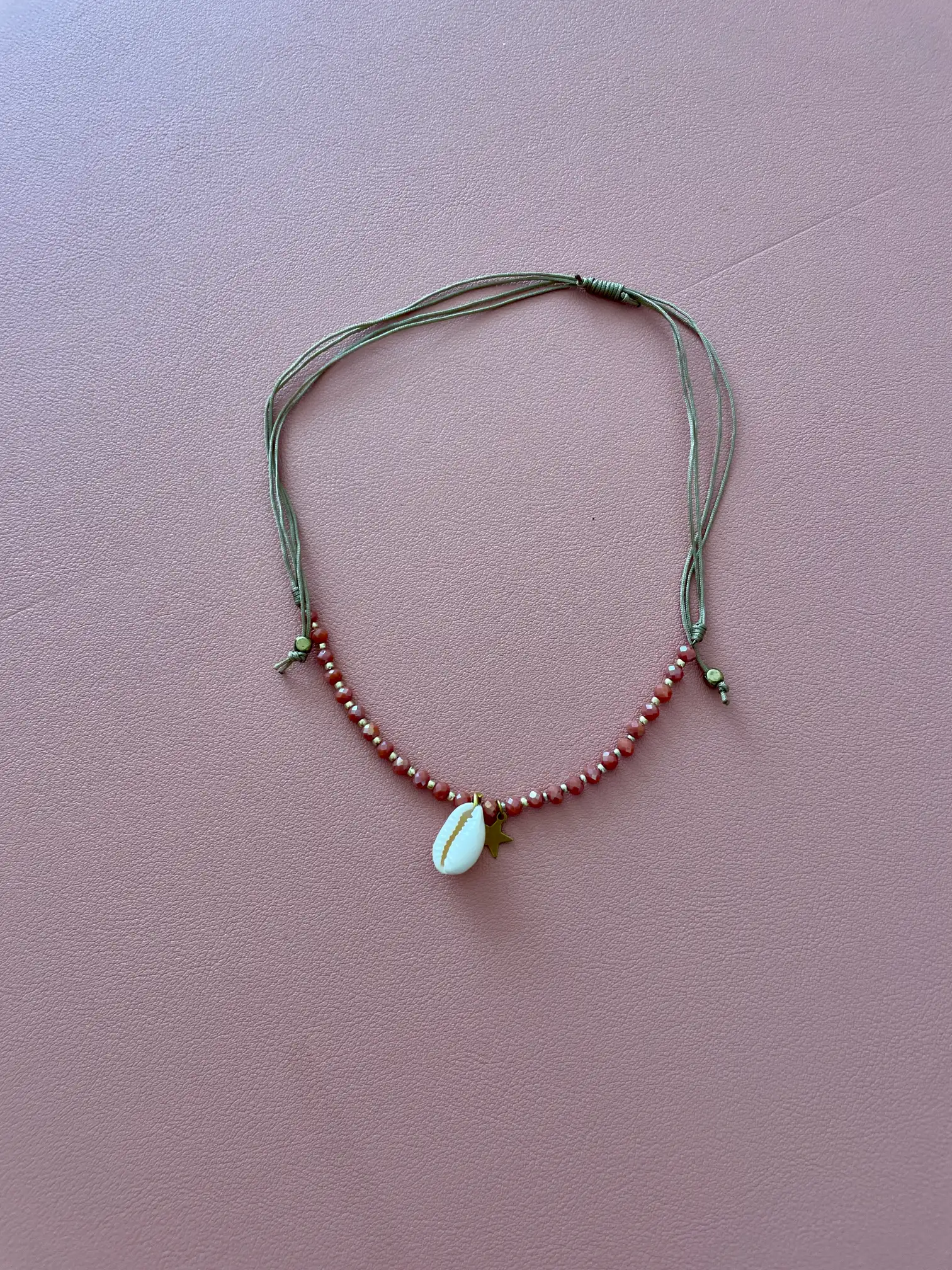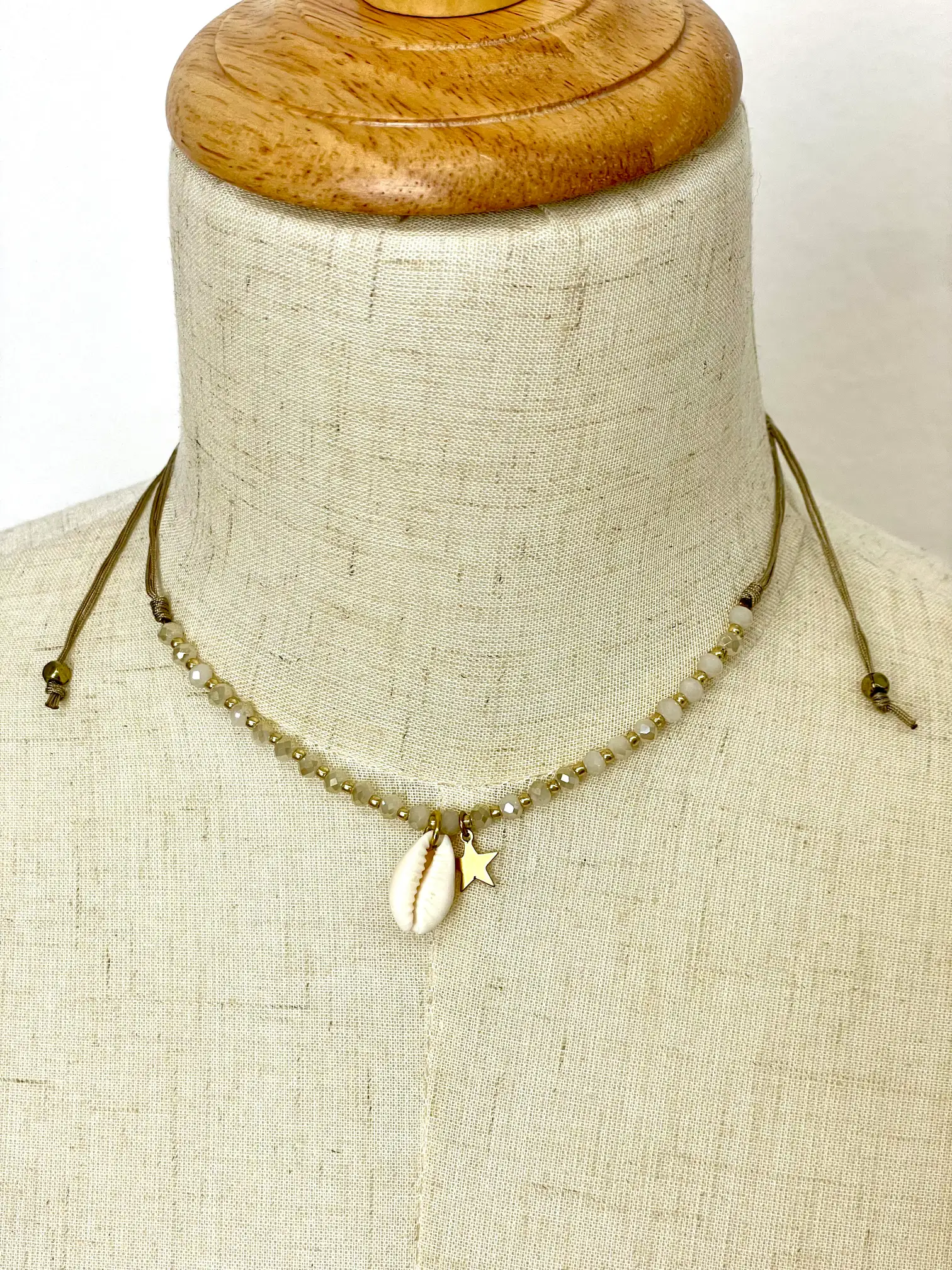 Gargantilla con una concha y una estrella dorada en el centro, rodeadas de pequeñas piedras blancas y doradas