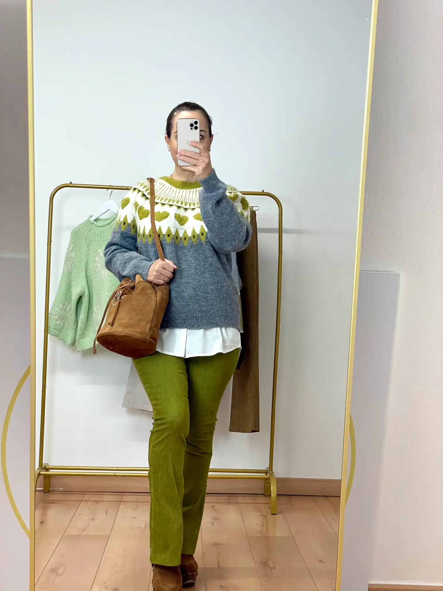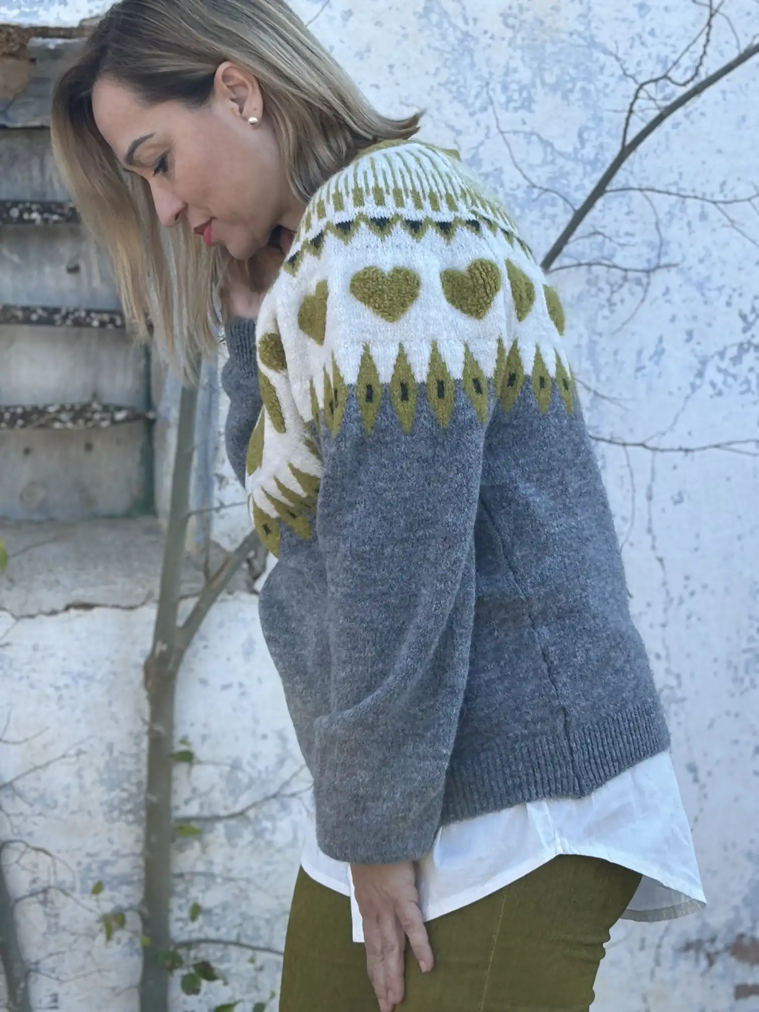 Jersey amplio. Suave y calentito. Viene combinado en tres colores que quedan genial: gris, pistacho y marfil
