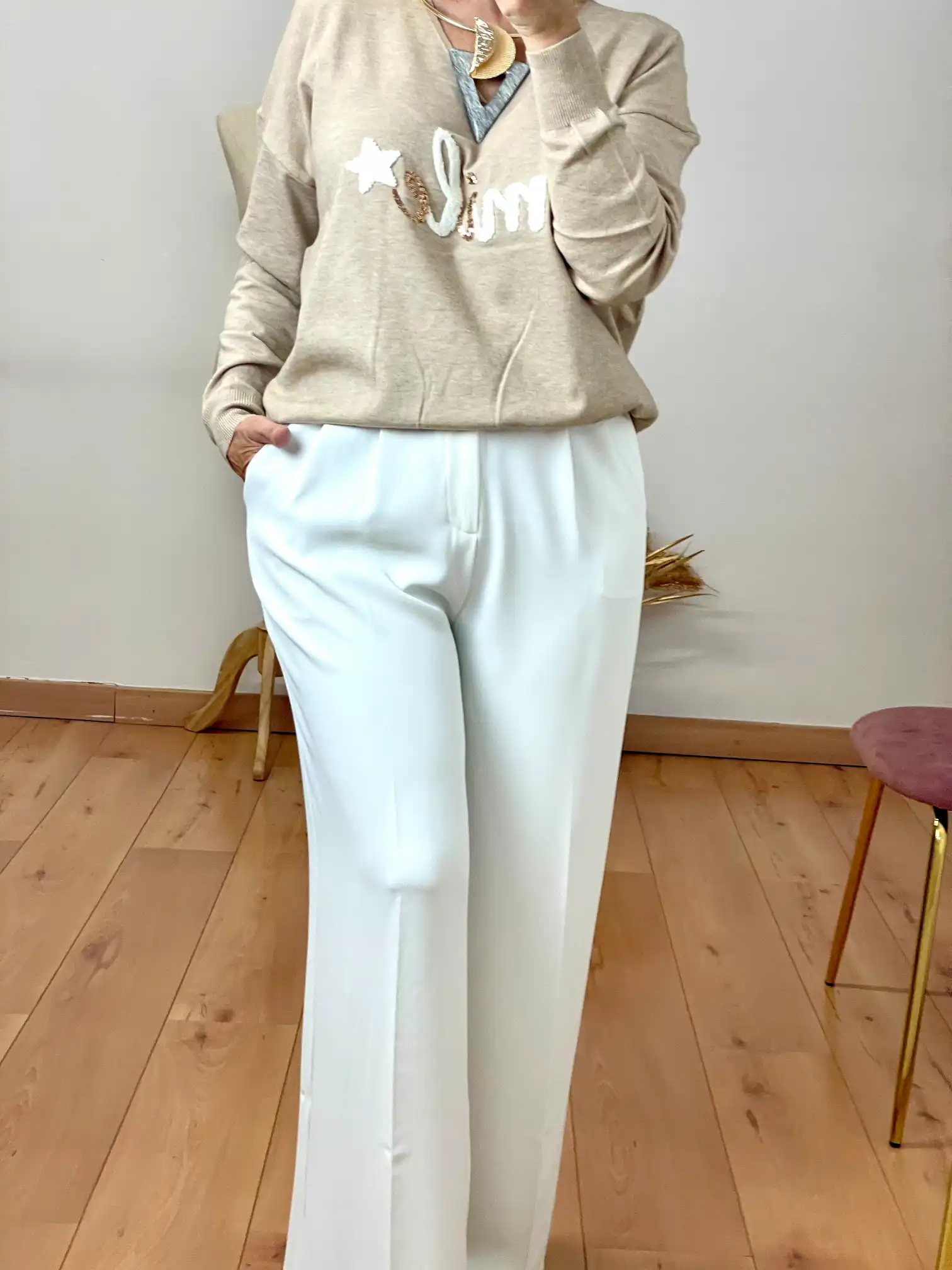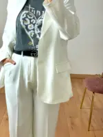 Pantalón de pinzas muy fluido y con mucha caída. Es recto. Lleva trabillas en la cintura para cinturón, bolsillos a ambos lados y falsos bolsillos en la parte trasera. Largo aproximado desde la cintura 108cm