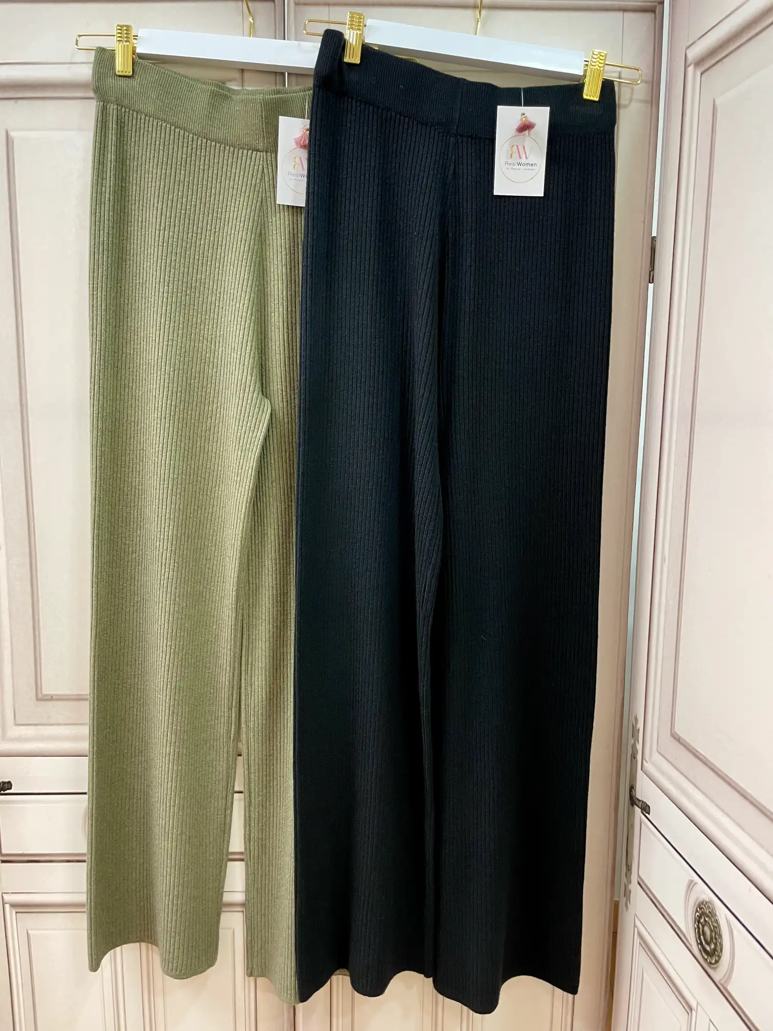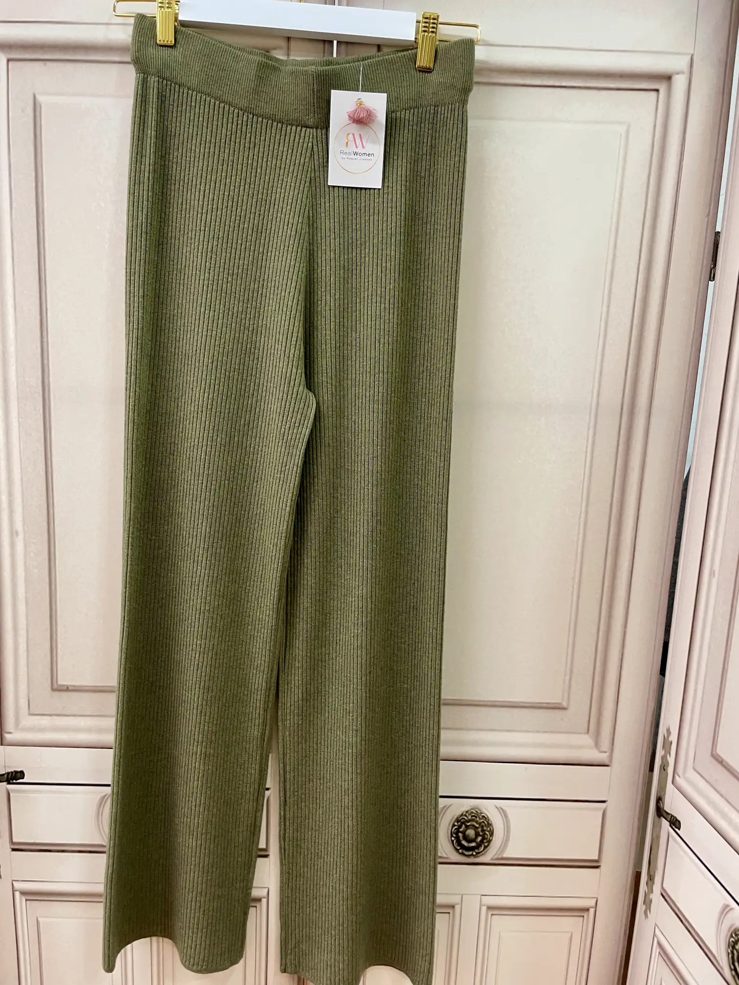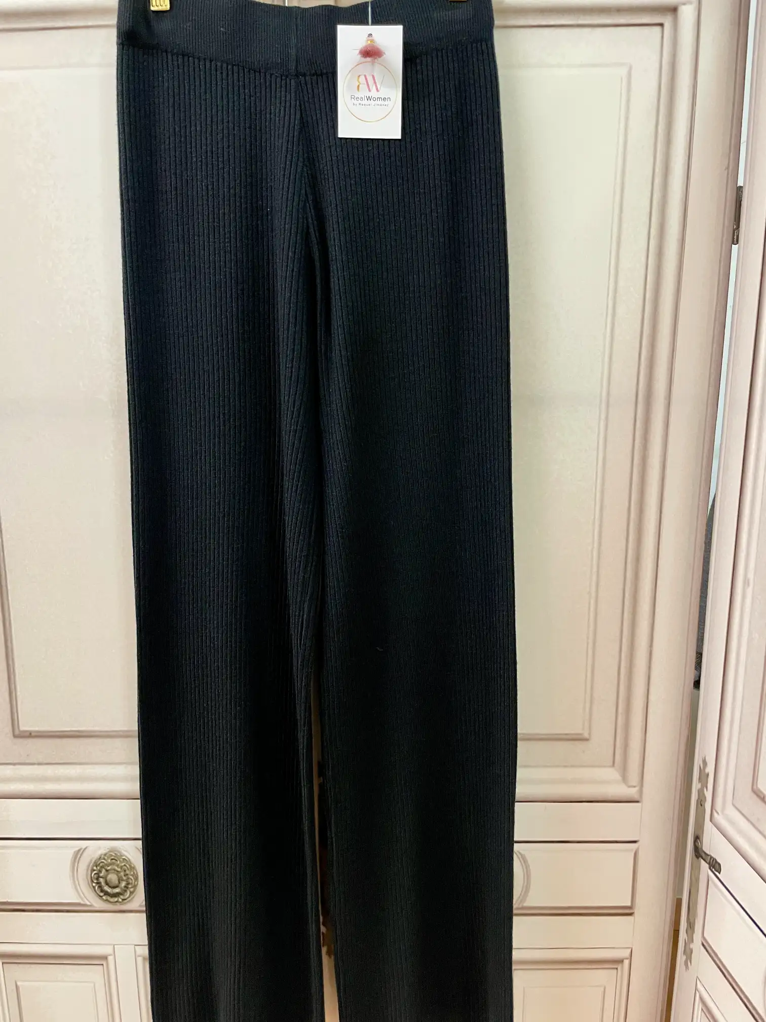 Pantalón de punto de canalé. Llega goma ancha en la cintura. Camal ancho. Largo aproximado de 99 cm