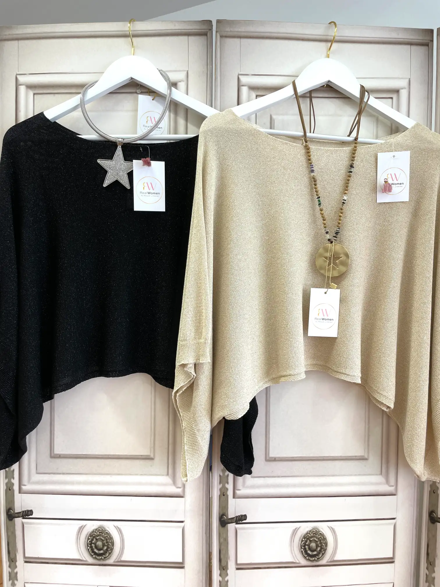 Poncho súper bonito con un ligero toque de brillo. Es muy amplio y súper combinable con cualquier outfit