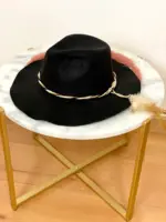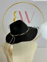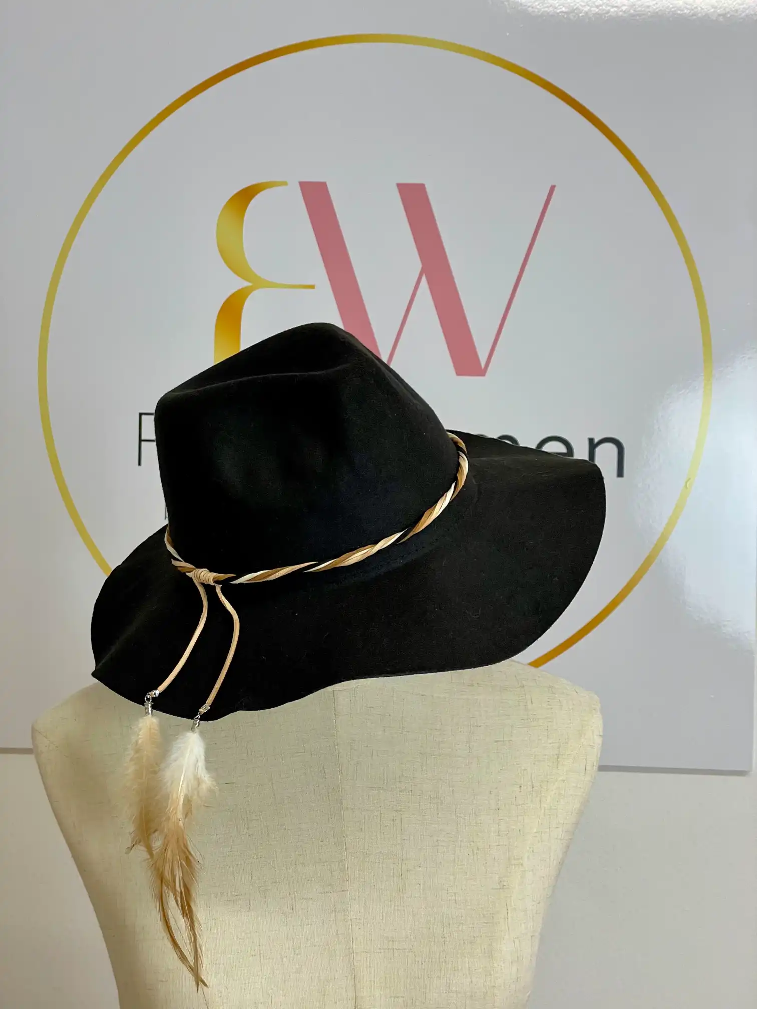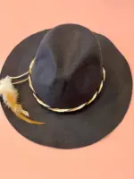 Sombrero negro trenzado con unas plumas de adorno. El tamaño se ajusta con una cinta interna