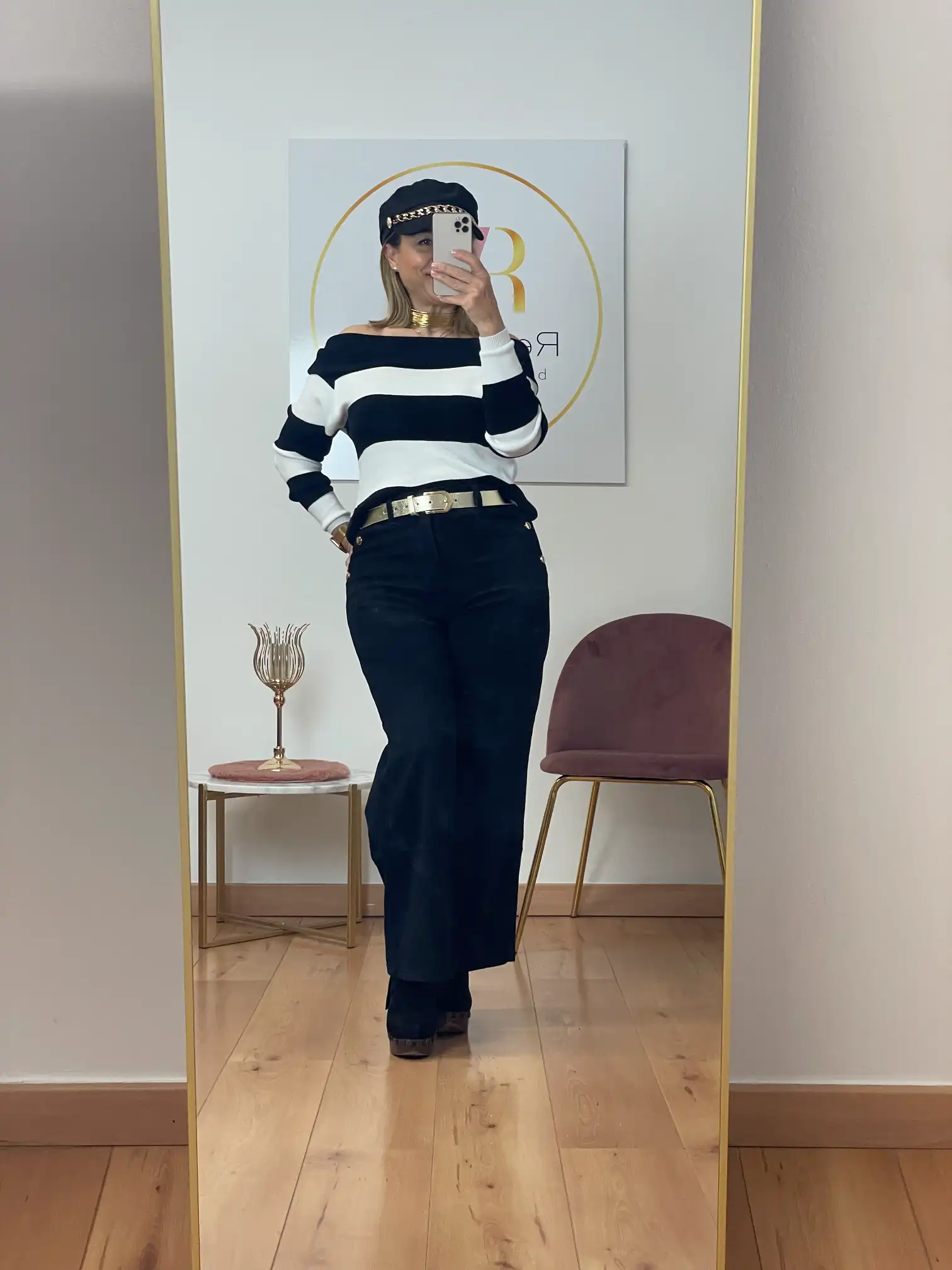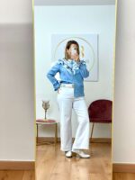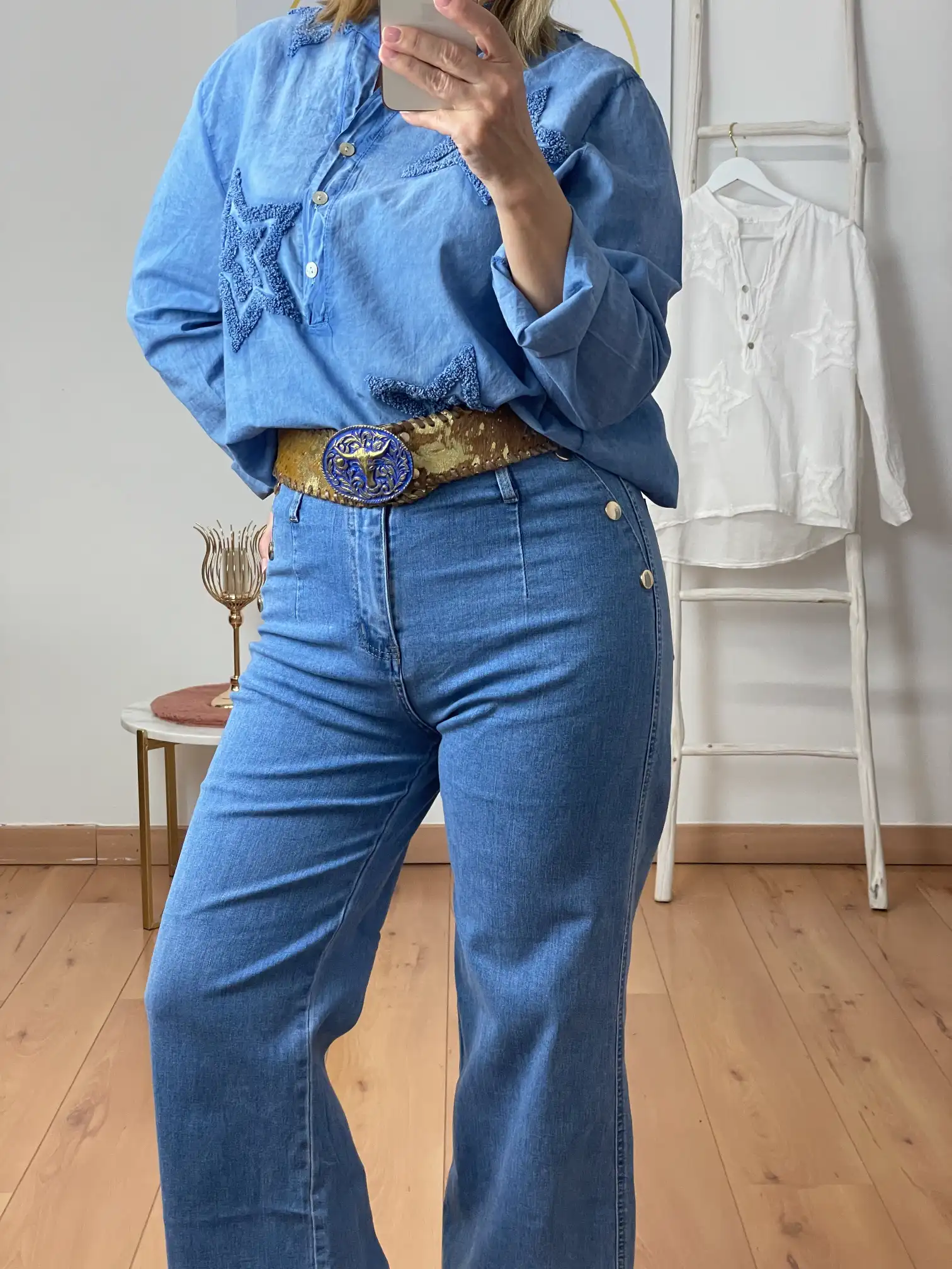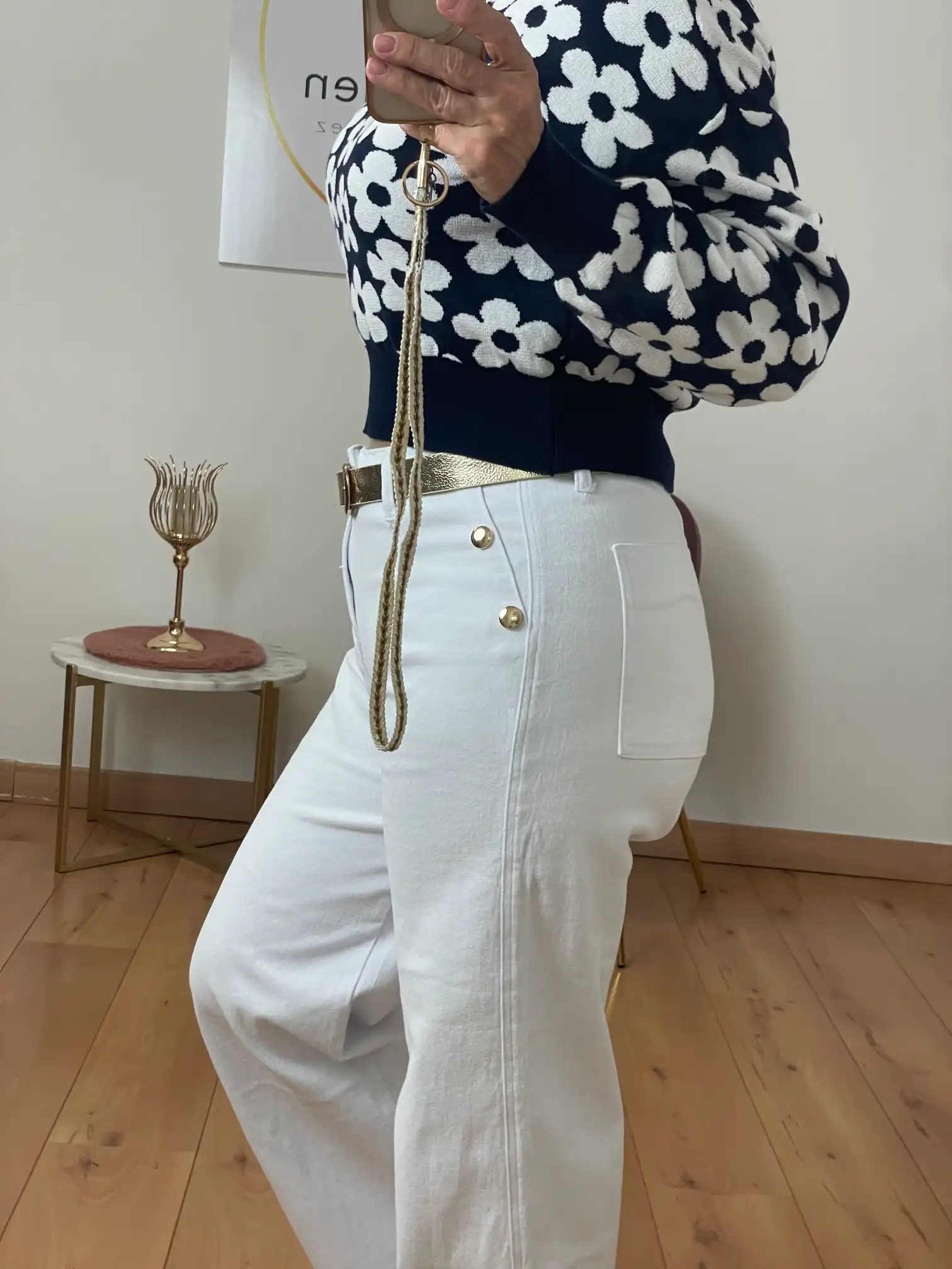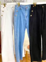 Vaqueros de talla alto y camal recto tobillero. Tiene 3 botones dorados a cada lado, trabillas para cinturón y 2 bolsillos traseros. Son elásticos. Largo aproximado 92cm
