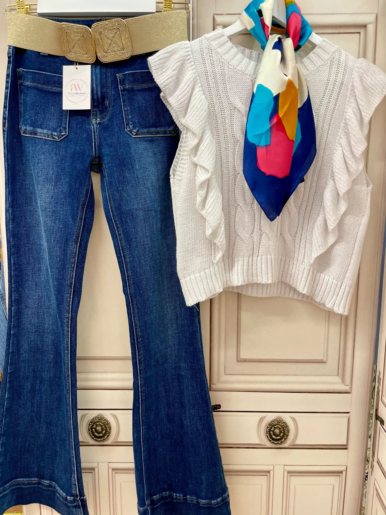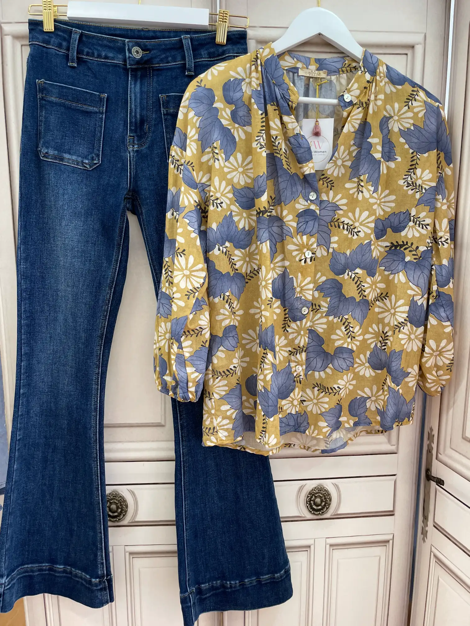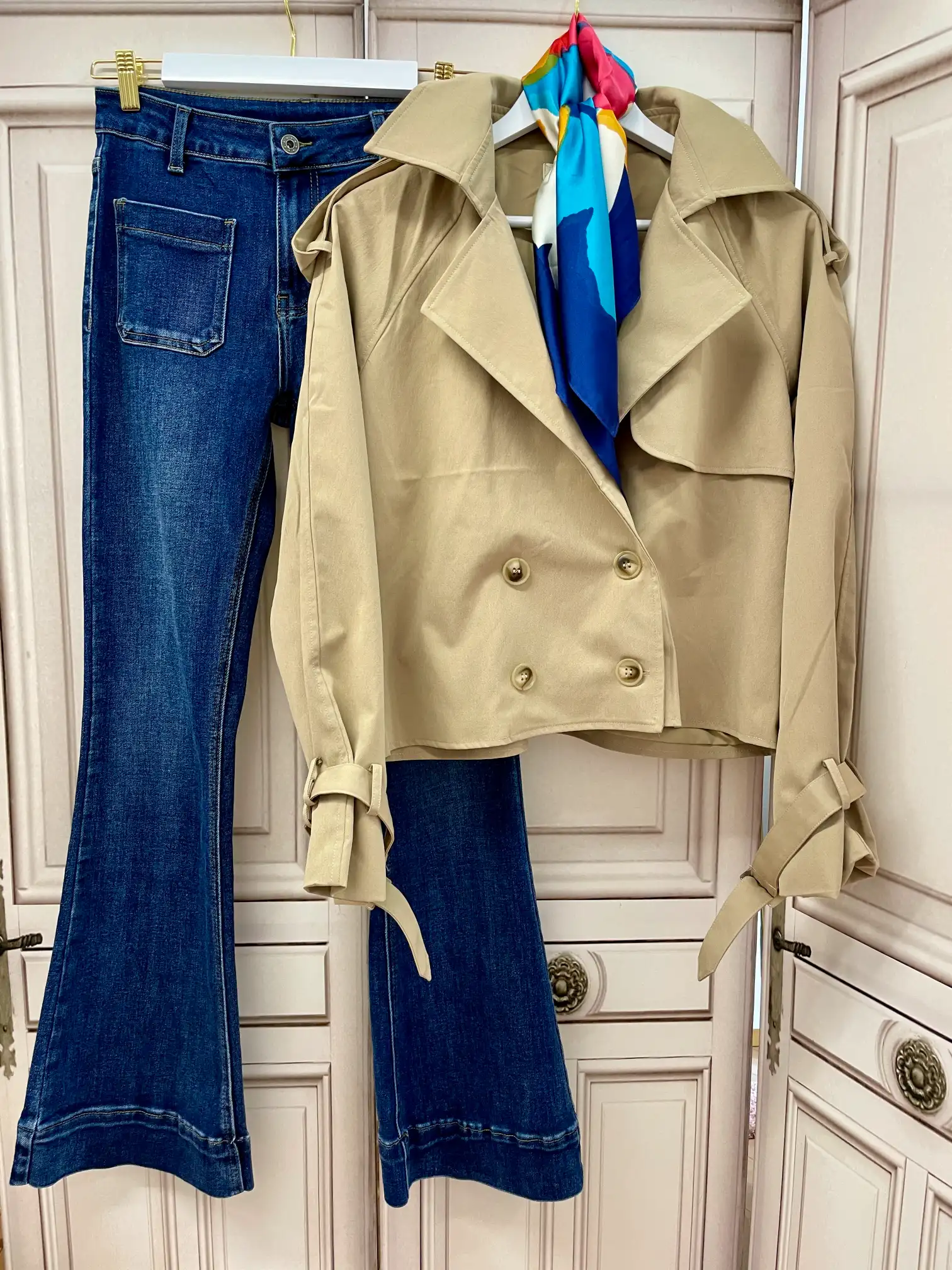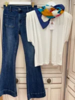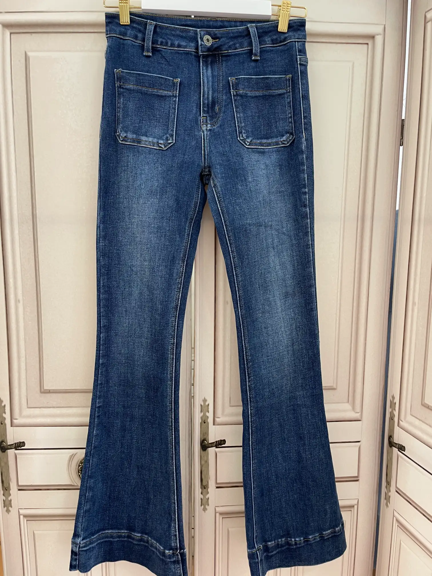 Estos vaqueros elásticos te van a encantar. Llevan dos bolsillos cuadrados en la parte delantera y trabillas en la cintura. En la parte trasera también llevan dos bolsillos. El bajo es acampanado con un falso dobladillo