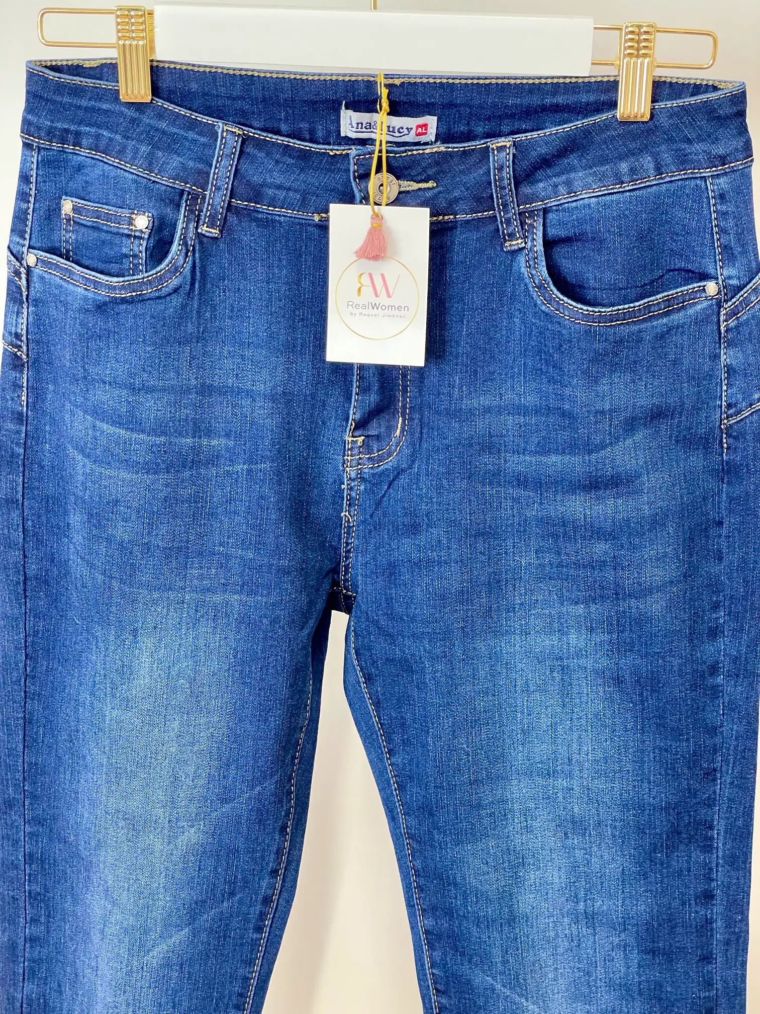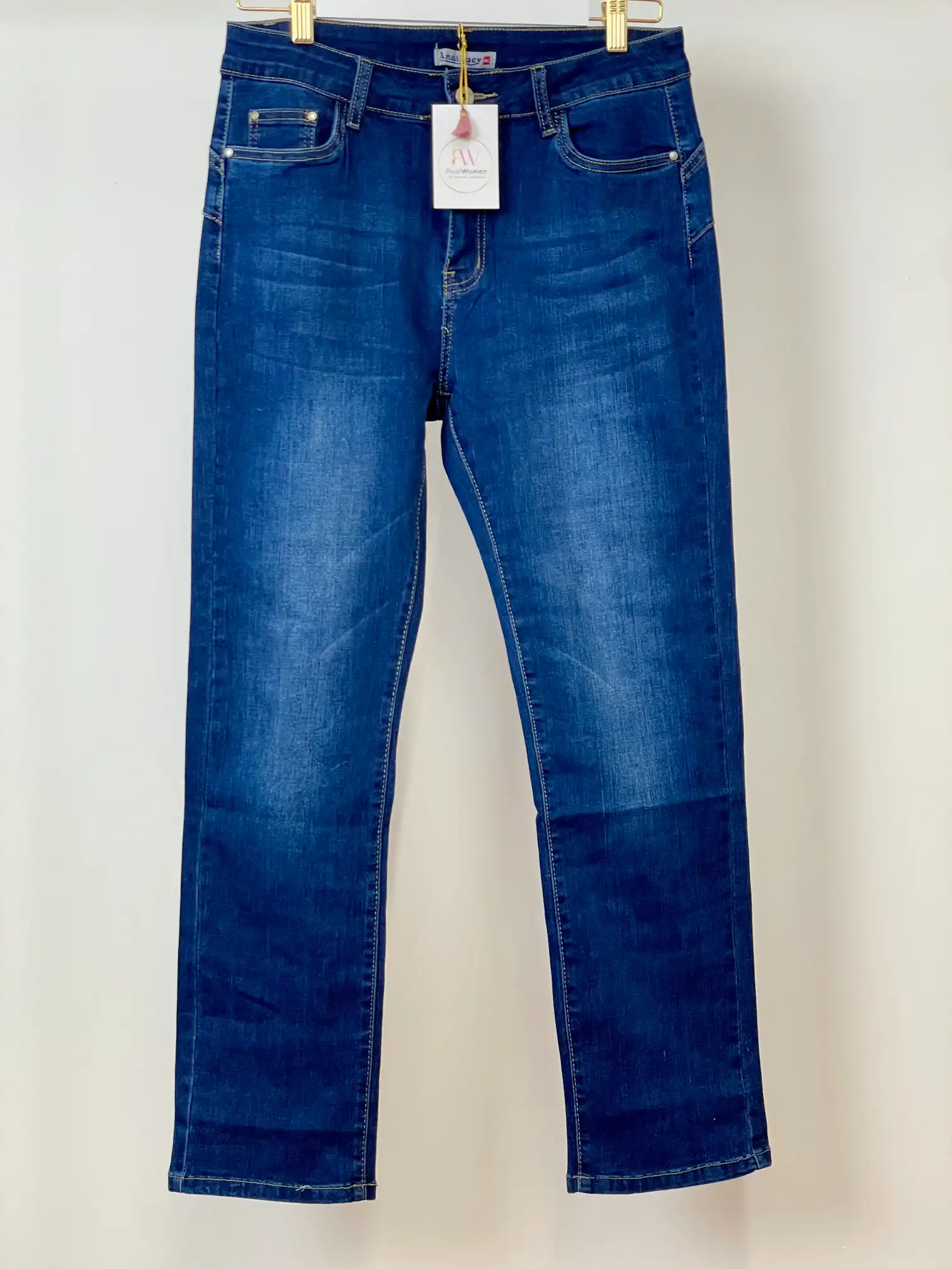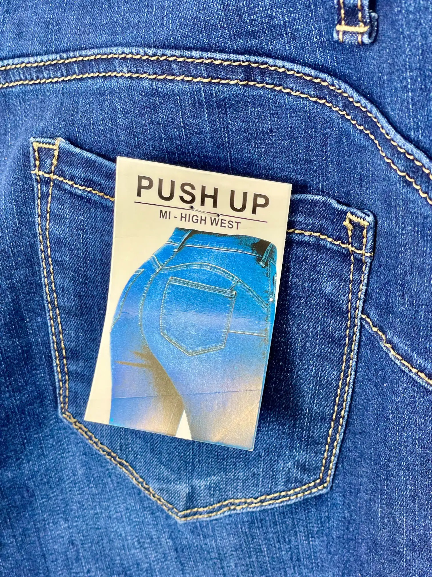 Vaquero push up recto. Bolsillos laterales y traseros y trabillas para cinturón. Elástico. Largo aproximado desde cintura 98cm