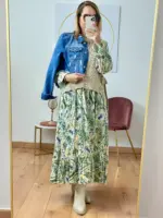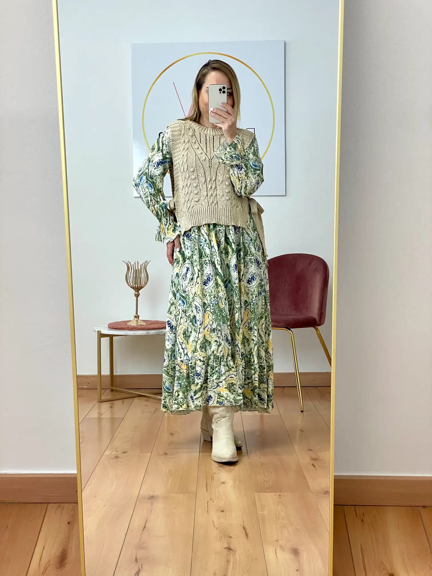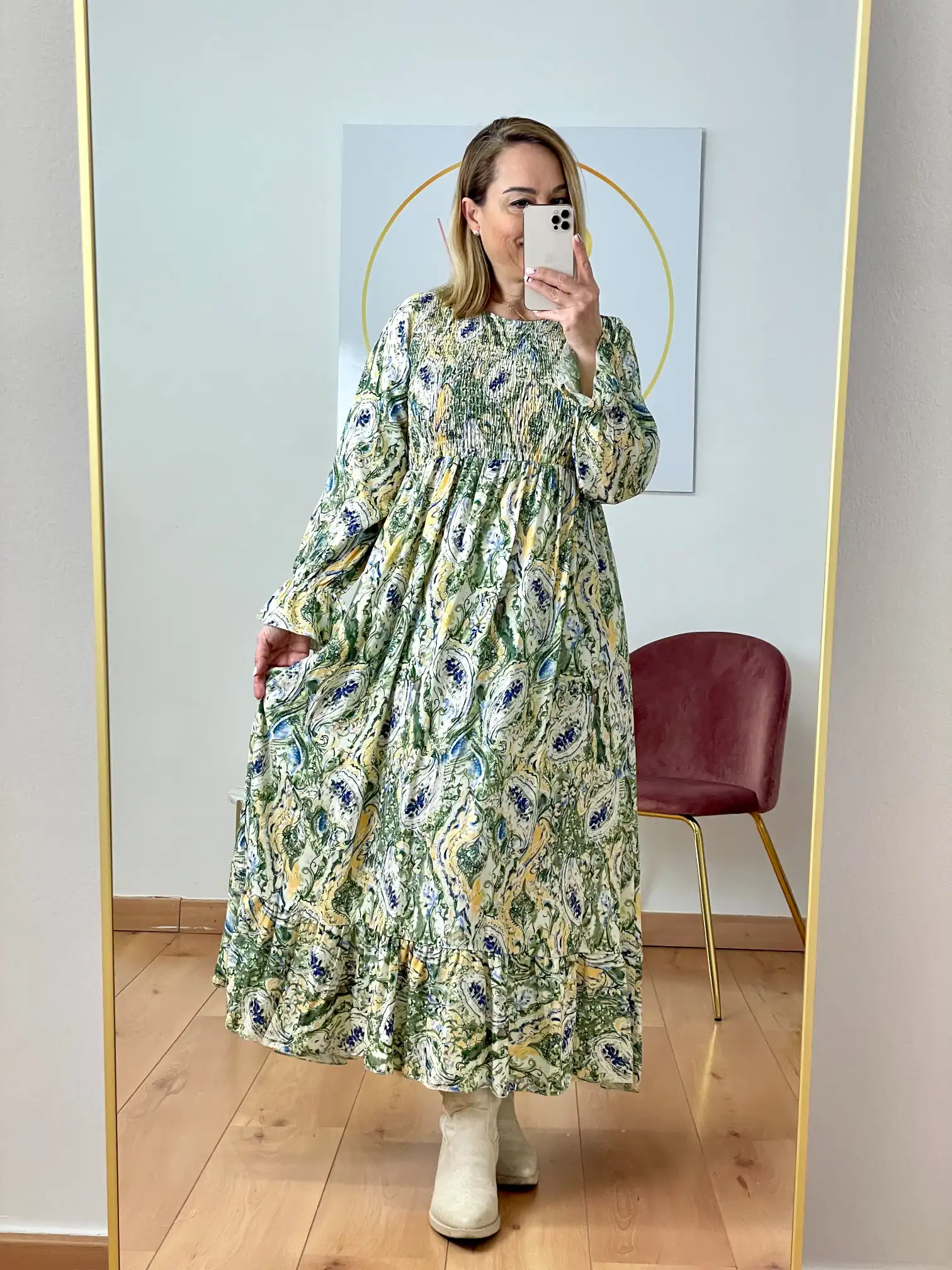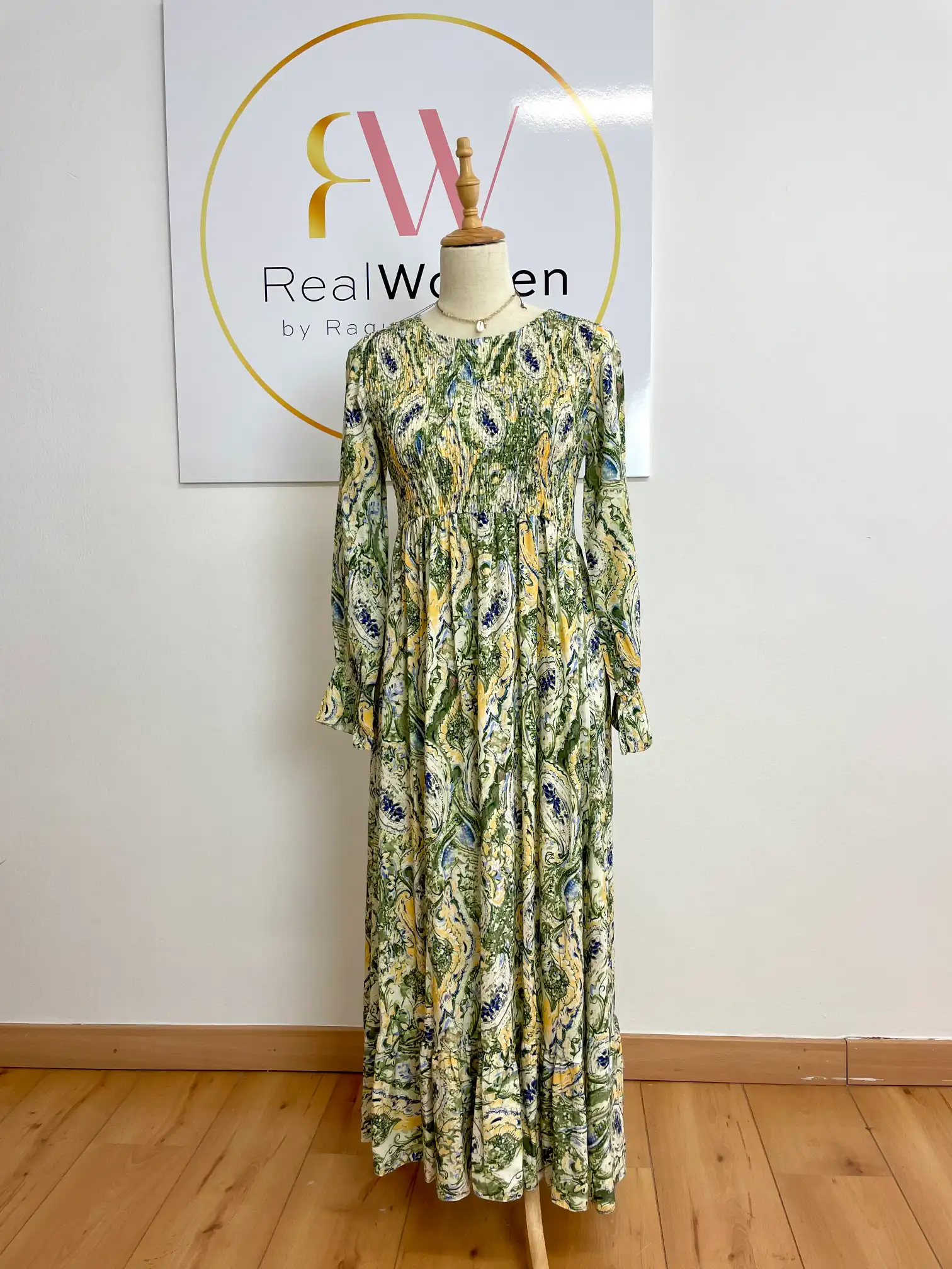 Vestido largo muy fluido. Tiene un ligero volante en el bajo y en los puños. El cuerpo va en nido de abeja y se ajusta muy bien a varias tallas. Largo aproximado desde el hombro: 124 cm.
